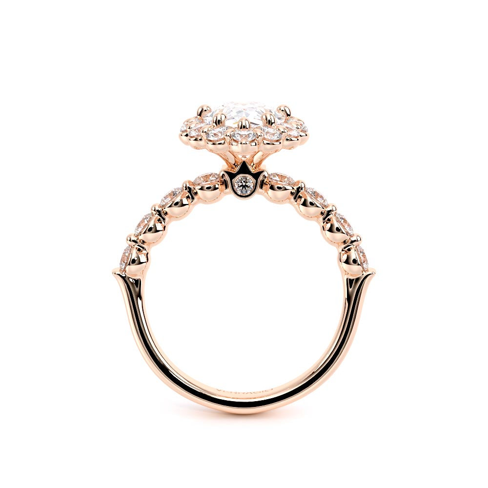Renaissance-990PS-2.5 features a diamond-rich, halo setting meticulously crafted to cradle each stone securely. Its sleek, shared-prong cup setting exudes elegance, while the design ensures both comfort and durability. Verragio's signature crest unifies this classic yet modern style.