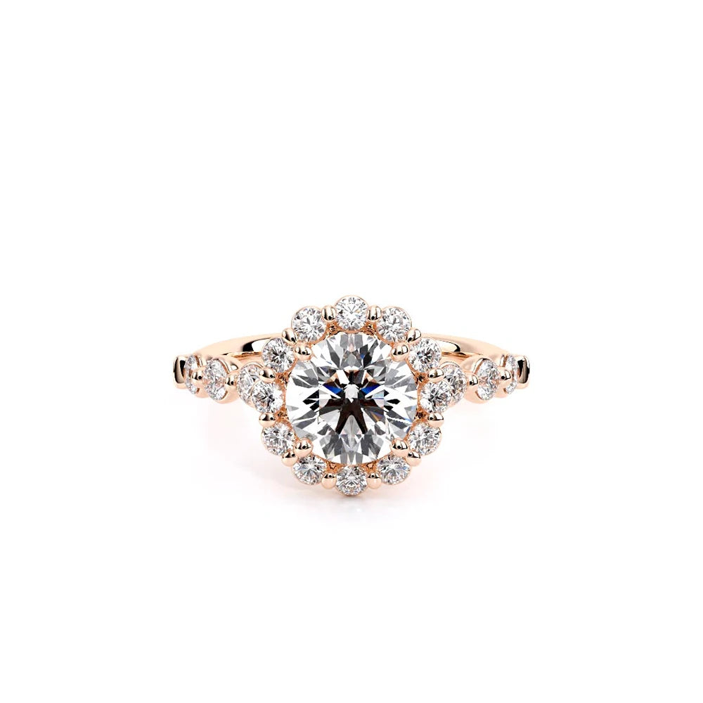 Renaissance-990R-2.5 features a diamond-rich, halo setting meticulously crafted to cradle each stone securely. Its sleek, shared-prong cup setting exudes elegance, while the design ensures both comfort and durability. Verragio's signature crest unifies this classic yet modern style.