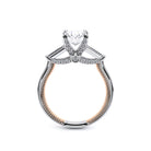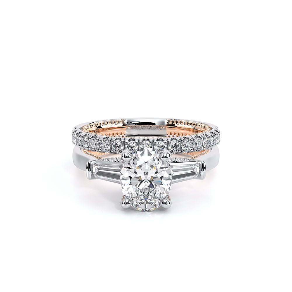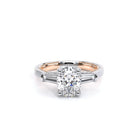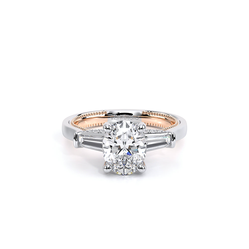 Renaissance-991OV-S is a captivating three-stone engagement ring featuring baguette diamonds. Pave diamonds beautifully frame your center stone; the simple shank adorned with delicate milgrain detail elevates this ring with vintage charm. The Verragio signature crest completes the refinement of this piece.