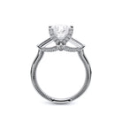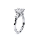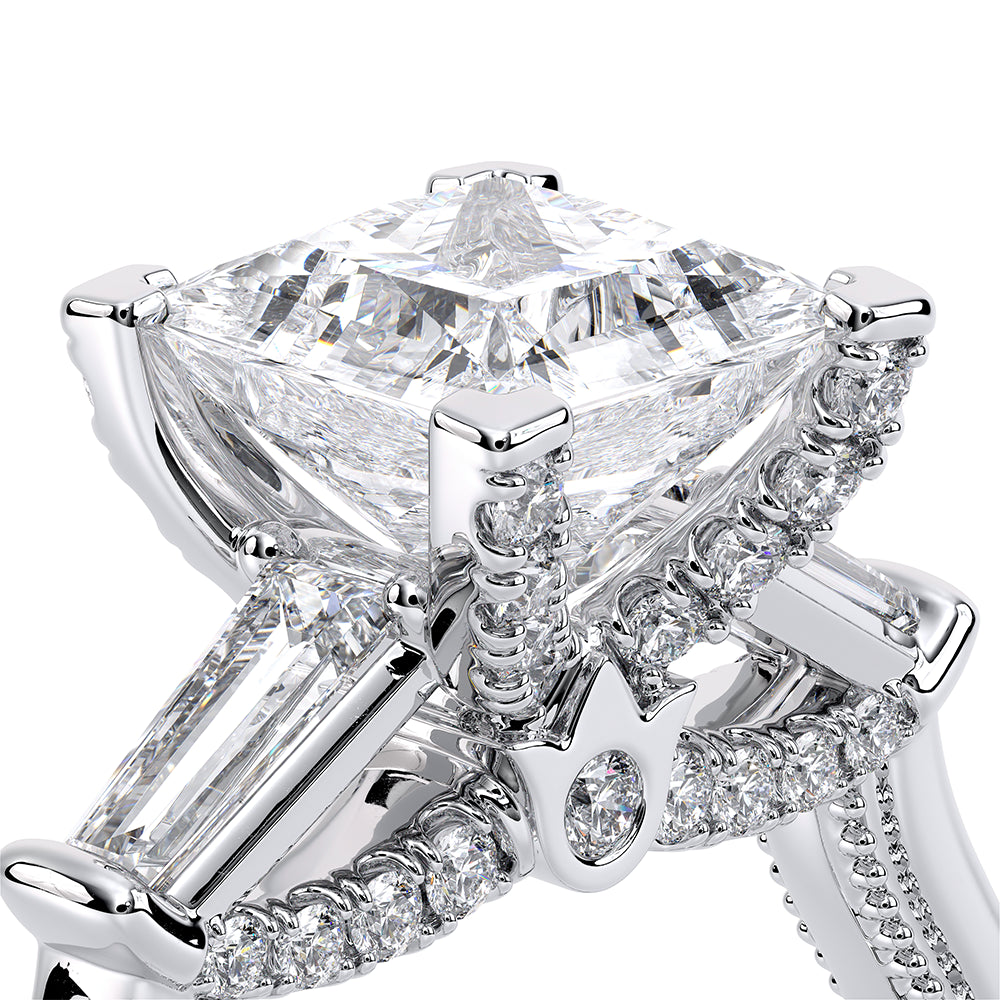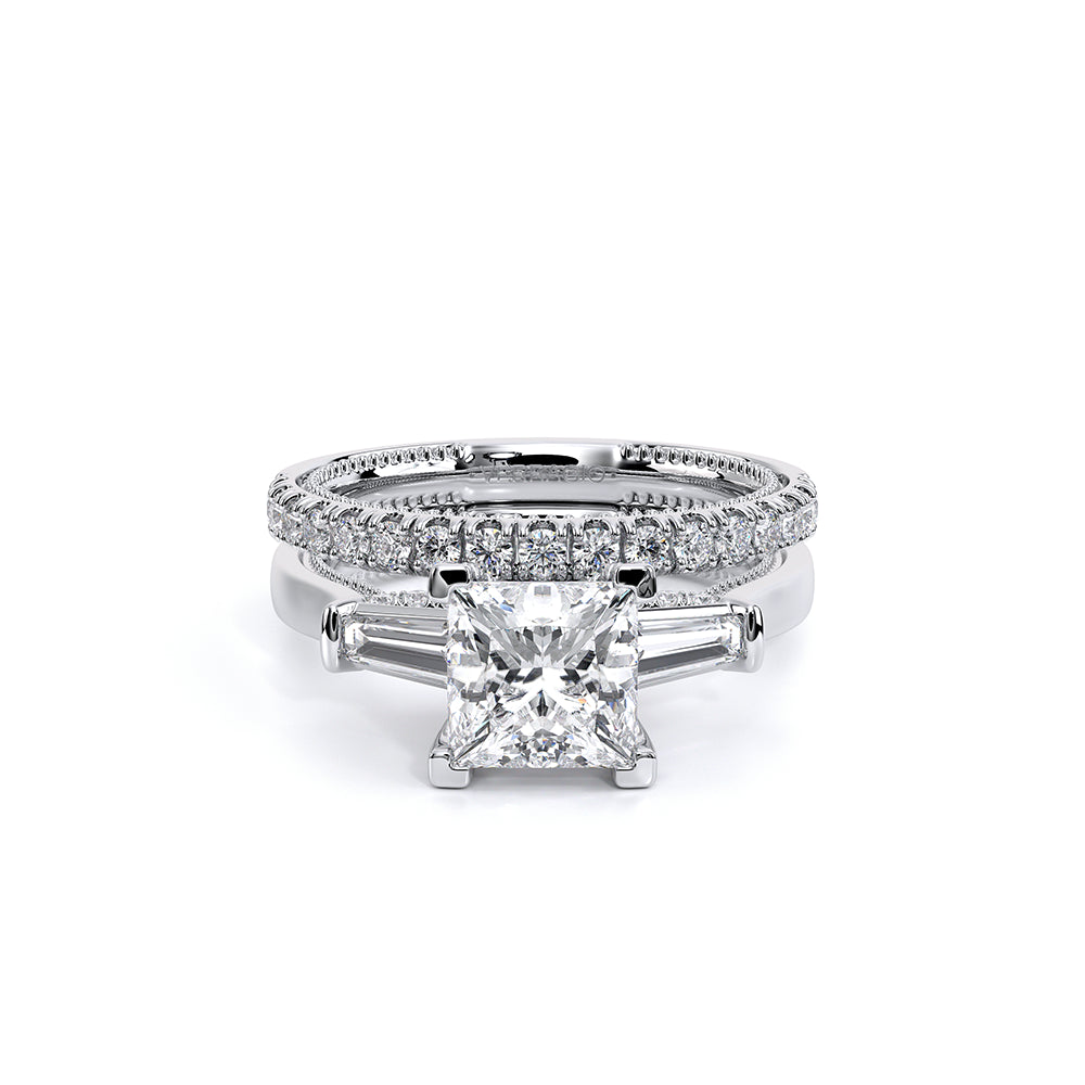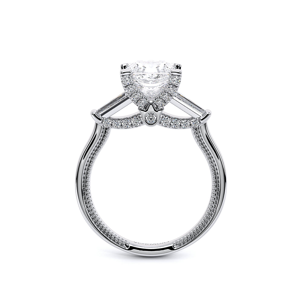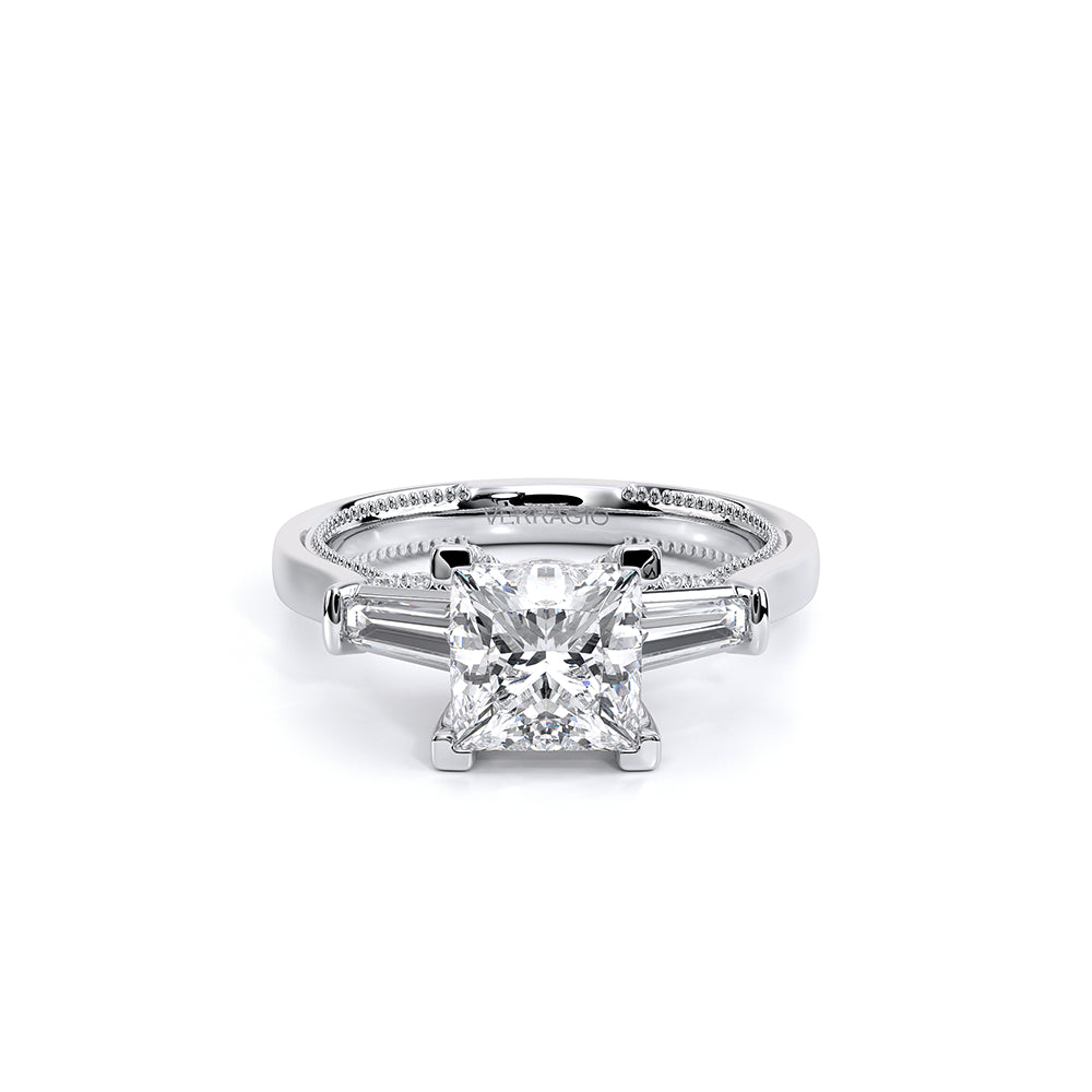 Renaissance-991P-S is a captivating three-stone engagement ring featuring baguette diamonds. Pave diamonds beautifully frame your center stone; the simple shank adorned with delicate milgrain detail elevates this ring with vintage charm. The Verragio signature crest completes the refinement of this piece.