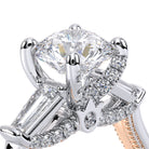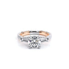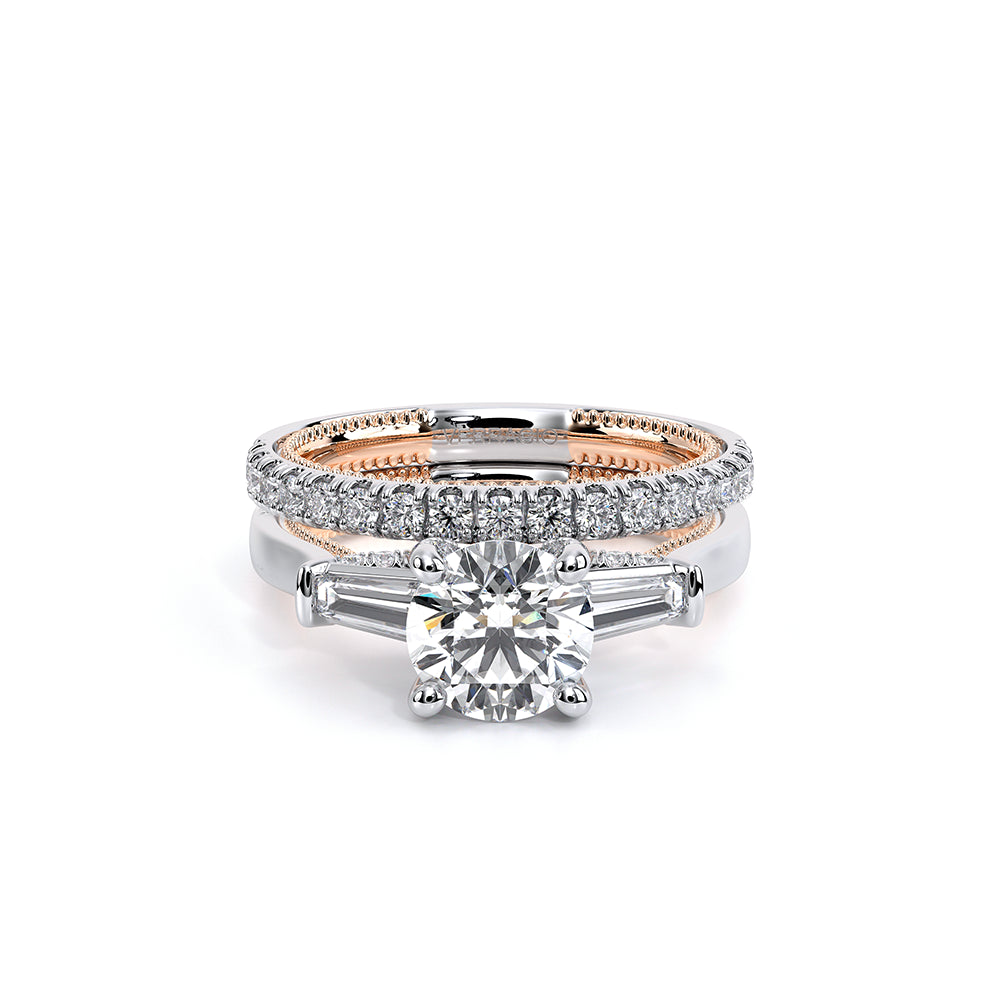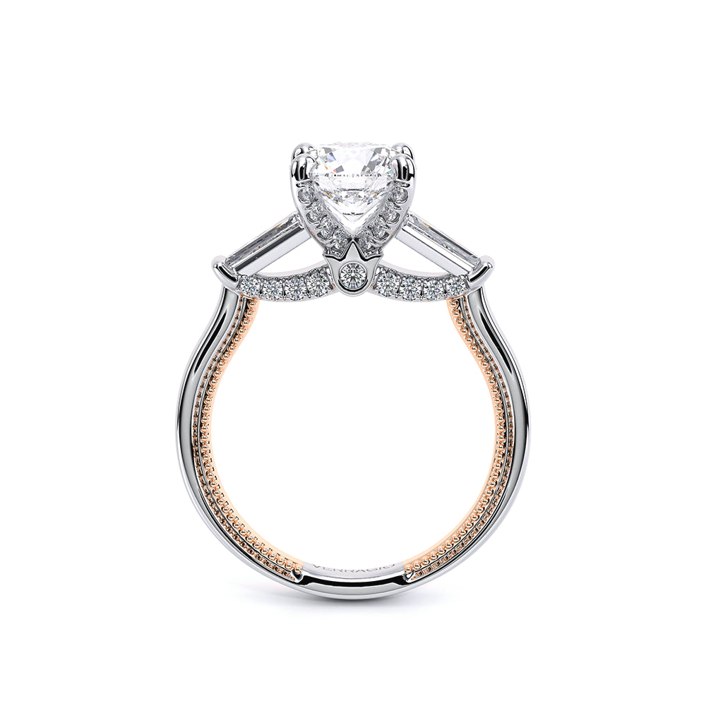 Renaissance-991R-S is a captivating three-stone engagement ring featuring baguette diamonds. Pave diamonds beautifully frame your center stone; the simple shank adorned with delicate milgrain detail elevates this ring with vintage charm. The Verragio signature crest completes the refinement of this piece.