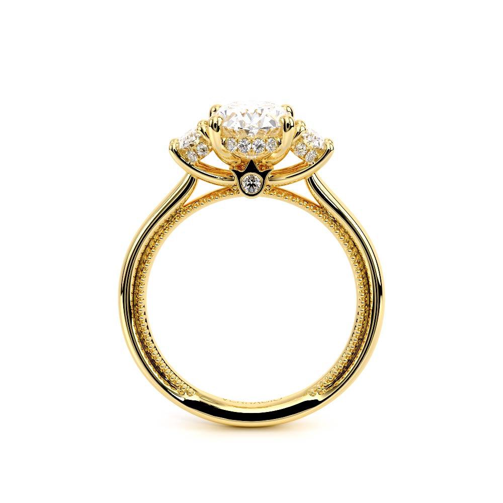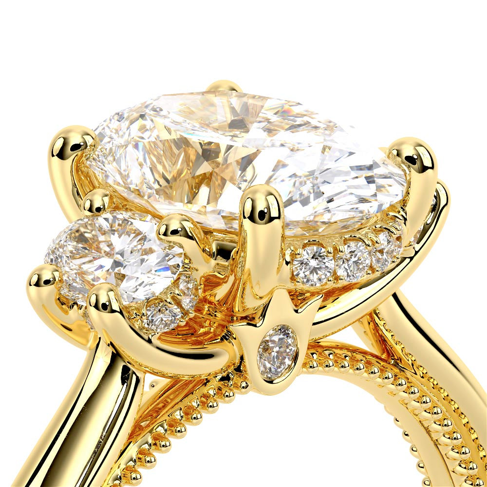 Renaissance-993OV-S features three dazzling Oval-cut side stones representing past, present, and future. The cathedral high-polish shank adds modern elegance with milgrain detailing and the signature Verragio crest make this ring a symbol of timeless love and commitment.