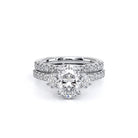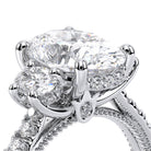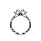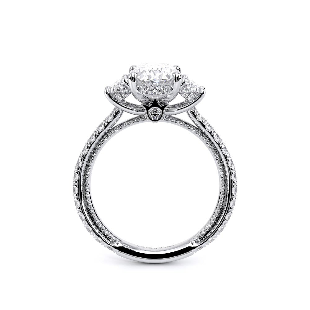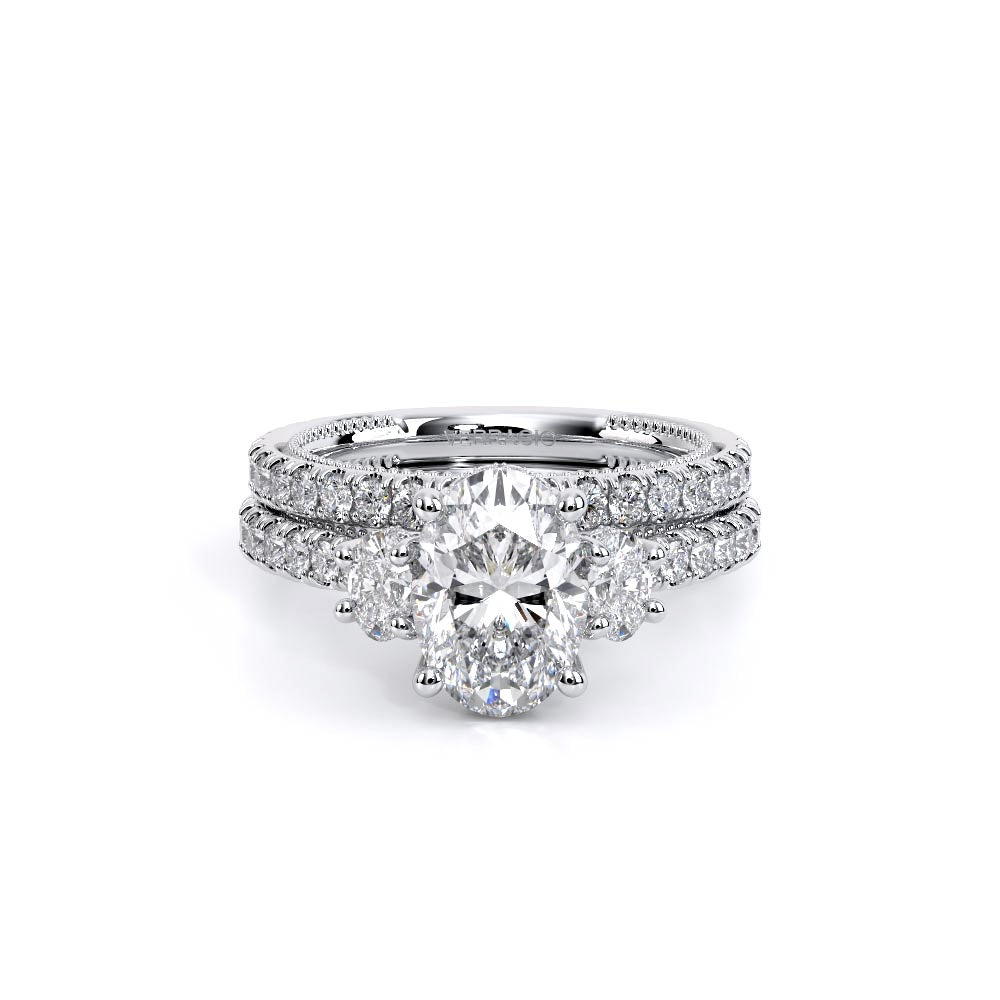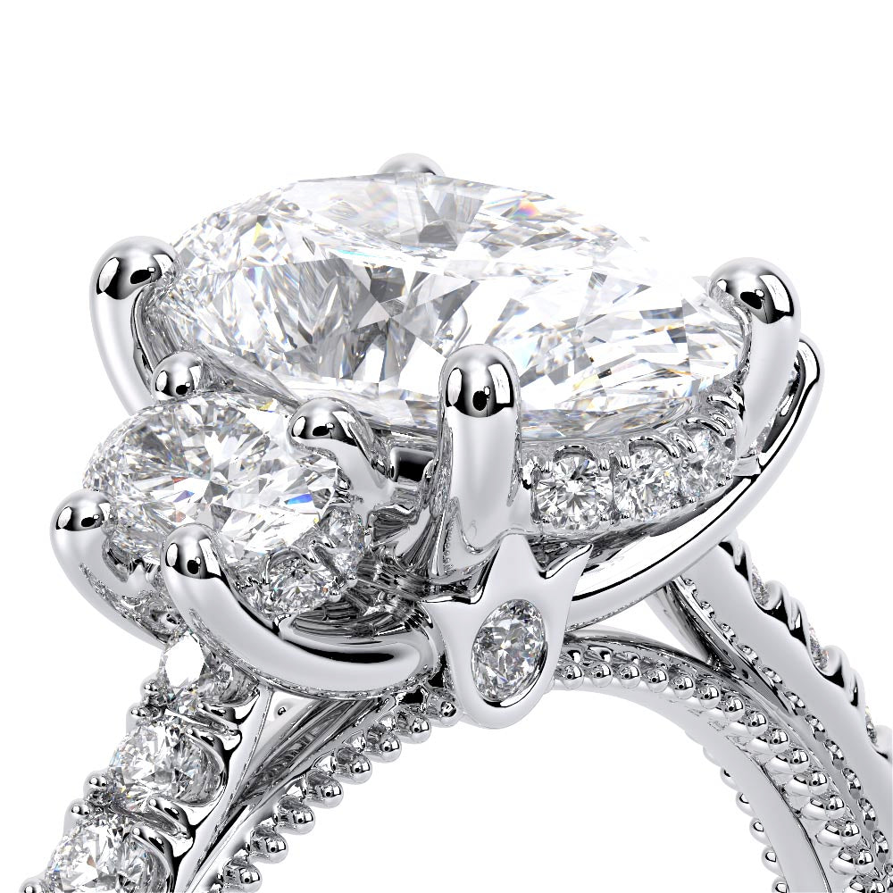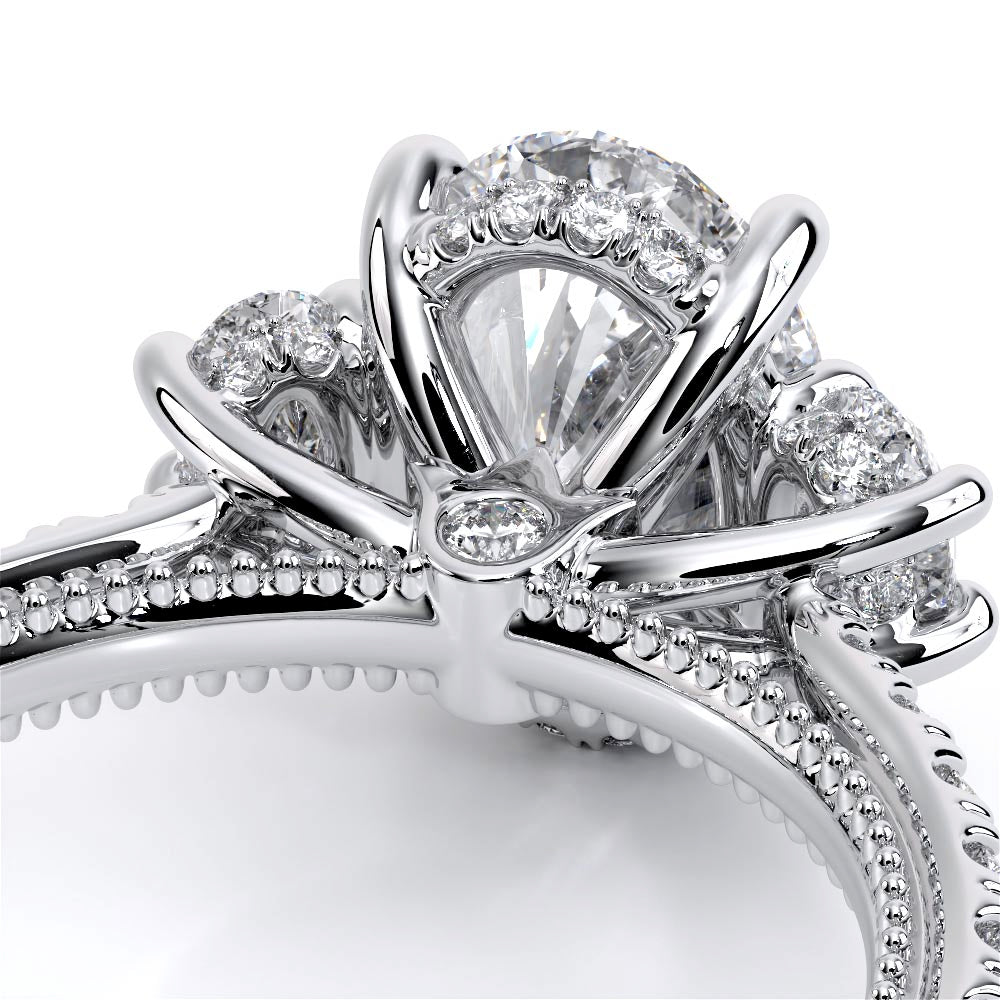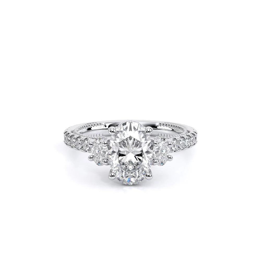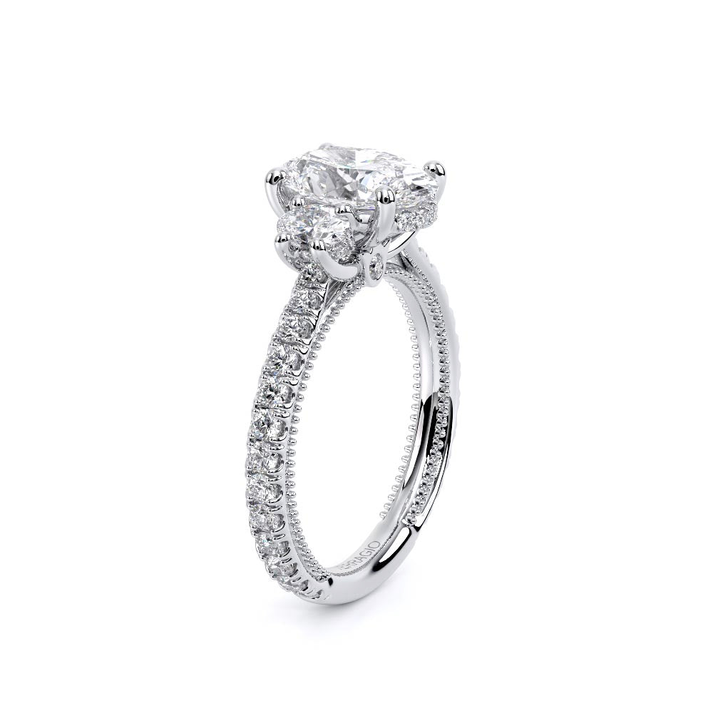 The Renaissance-993OV-1.7 showcases three stones adorned with a distinctive diamond bridge that elevates the center stone, enhancing its brilliance. The cathedral shank adds a touch of modern elegance with its delicate diamonds, while milgrain detailing and the signature Verragio crest collectively make this ring a symbol of timeless love and commitment.