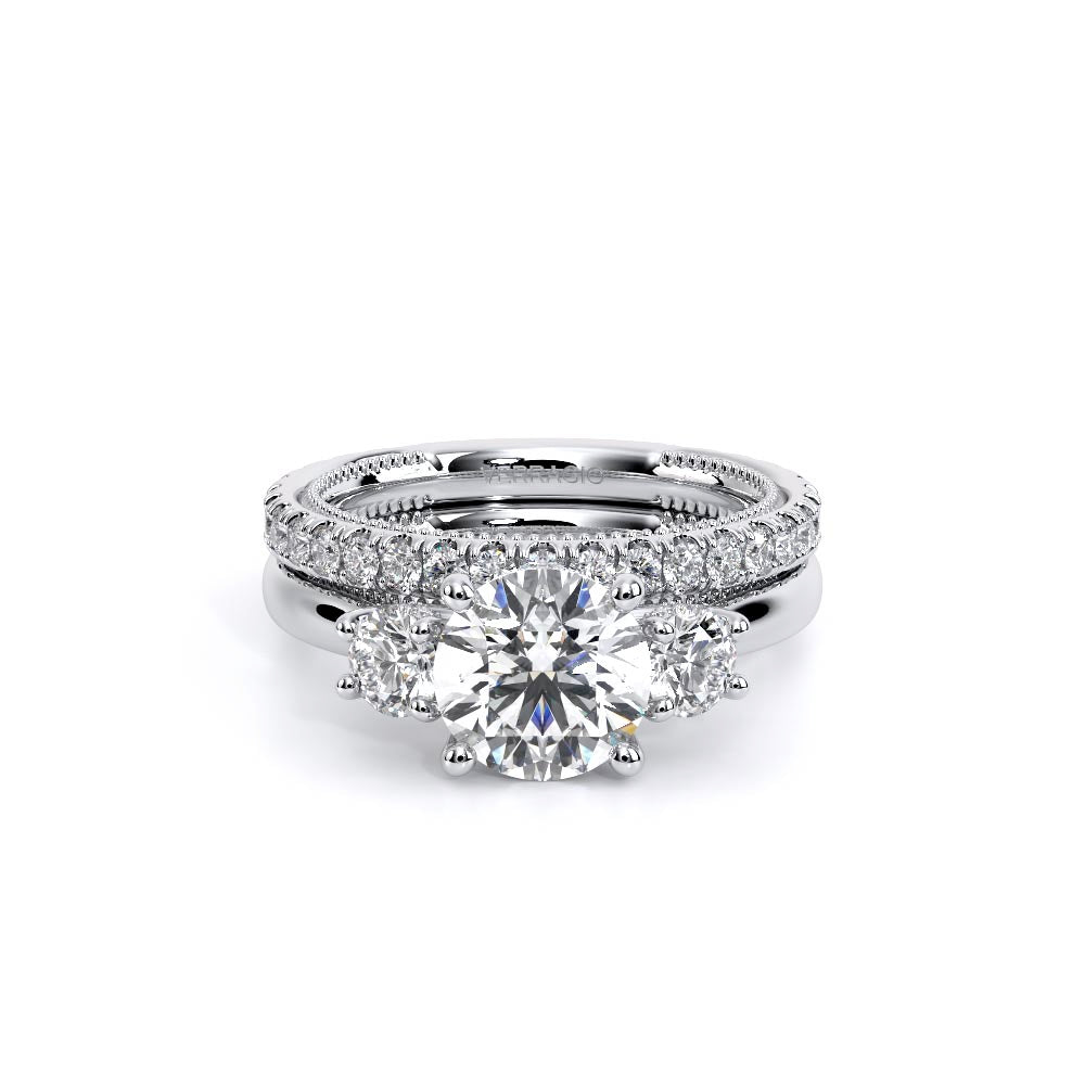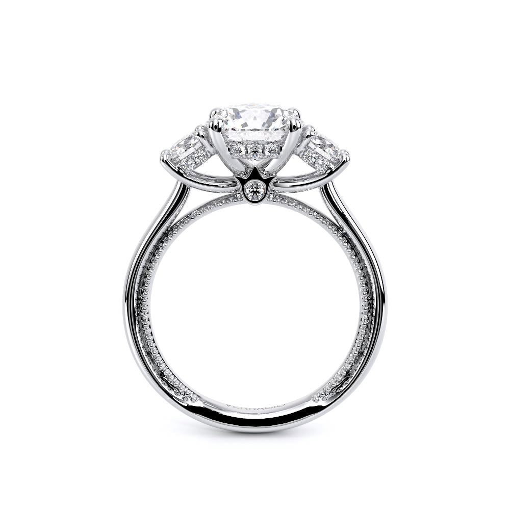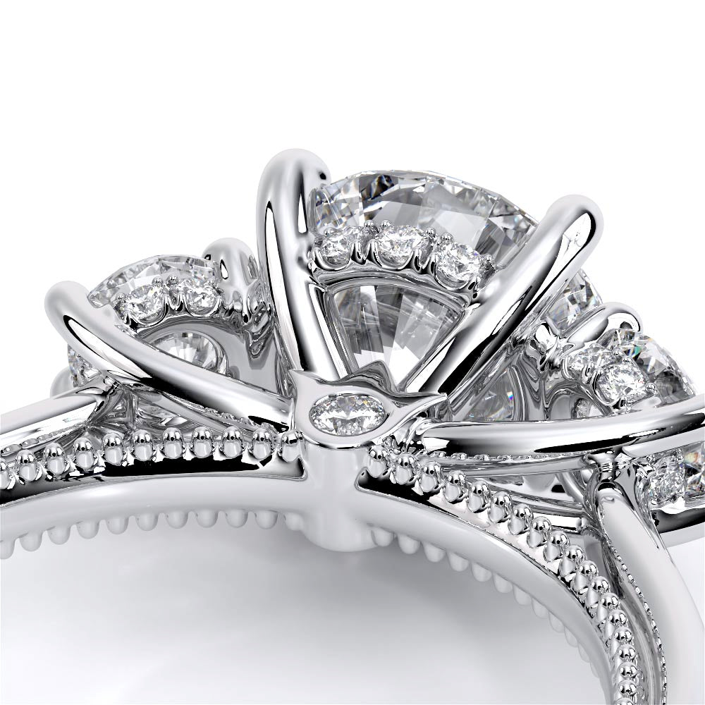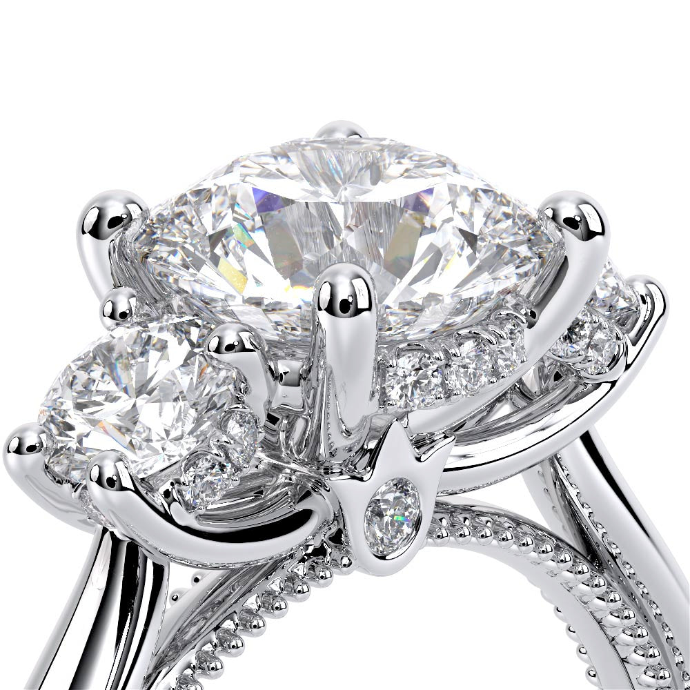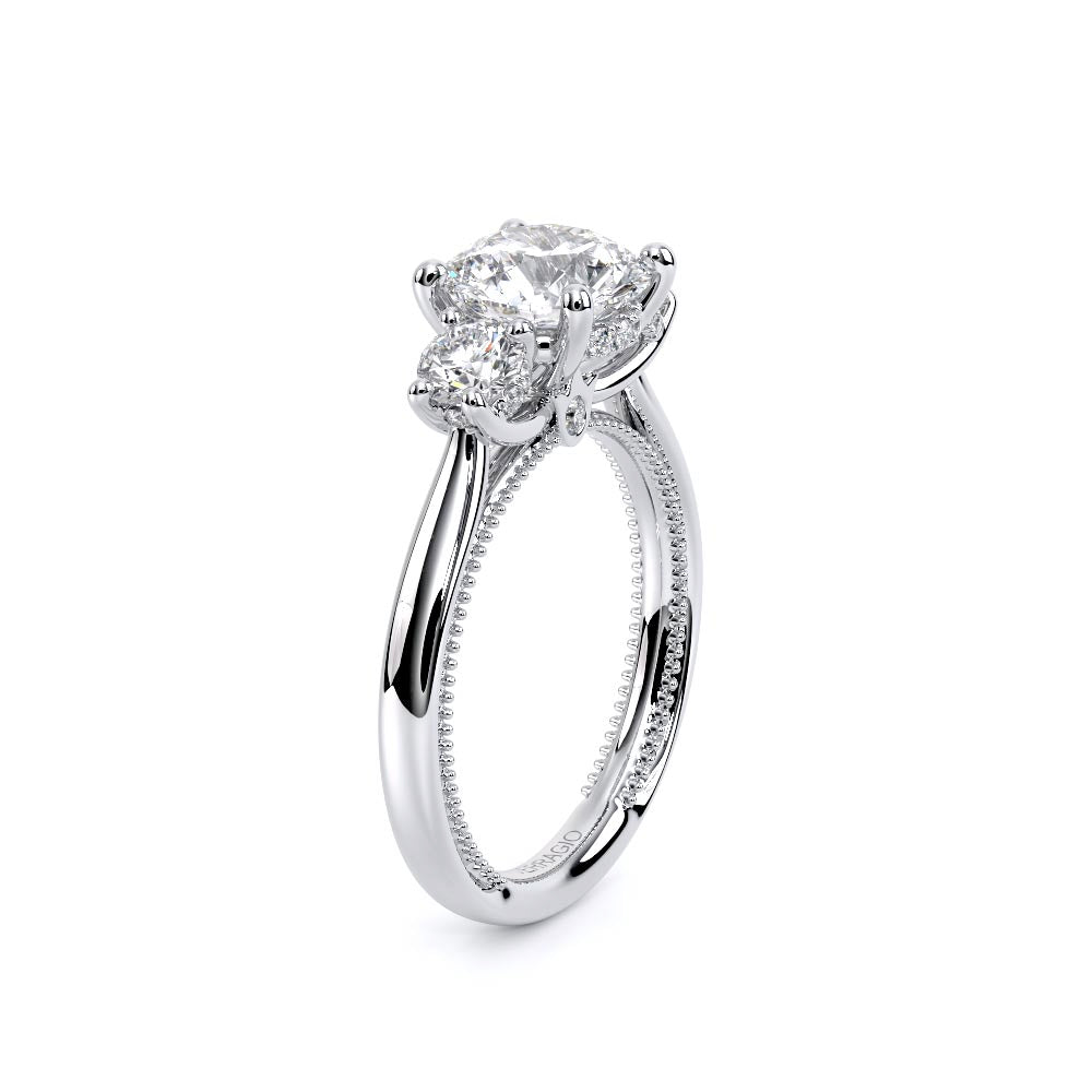 Renaissance-993R-S features three dazzling side stones representing past, present, and future. The cathedral high-polish shank adds modern elegance with milgrain detailing and the signature Verragio crest make this ring a symbol of timeless love and commitment.