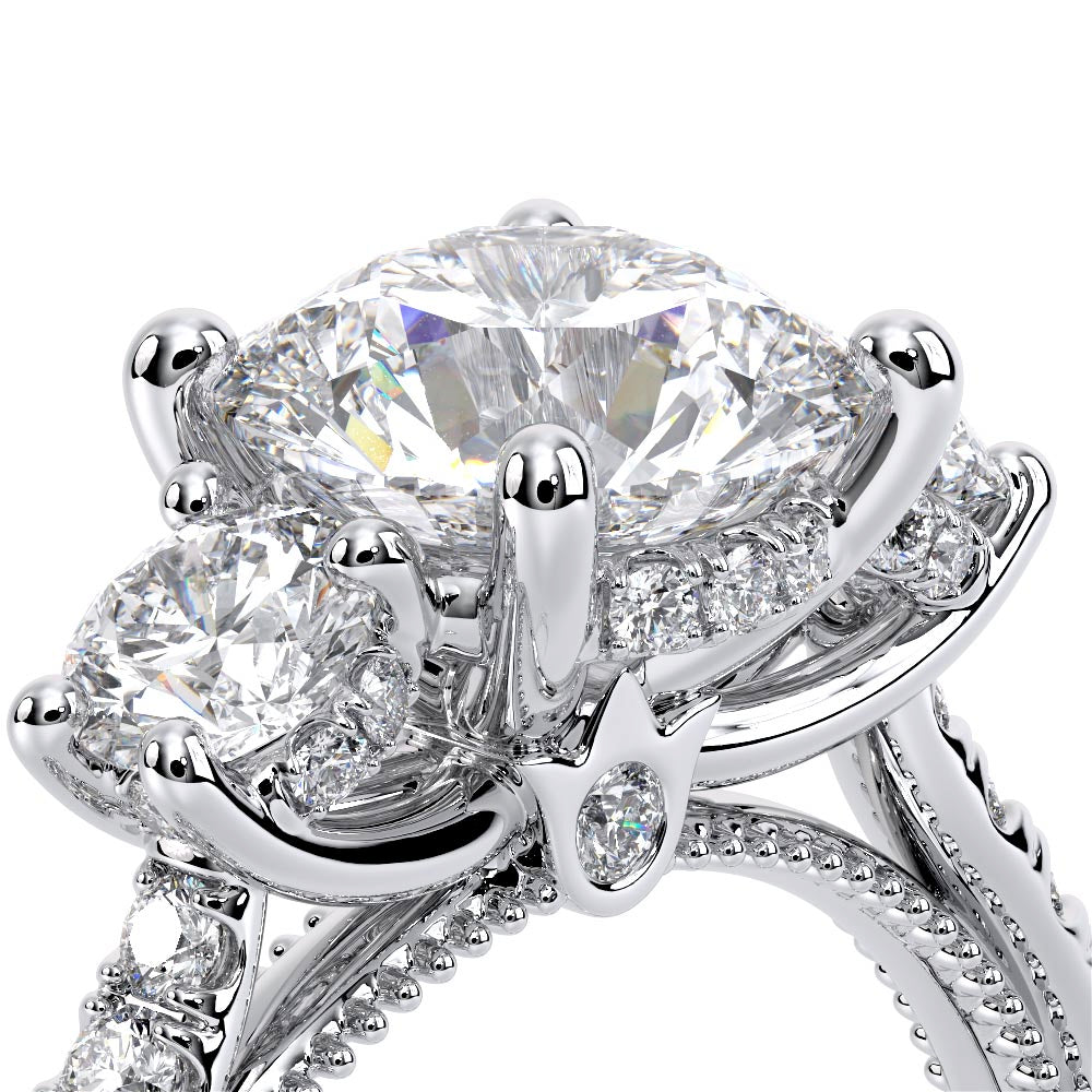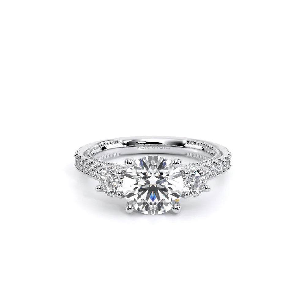 Renaissance-993R-1.7 features three dazzling stones representing past, present, and future. The cathedral shank adds modern elegance with its delicate diamonds. Milgrain detailing and the signature Verragio crest make this ring a symbol of timeless love and commitment.