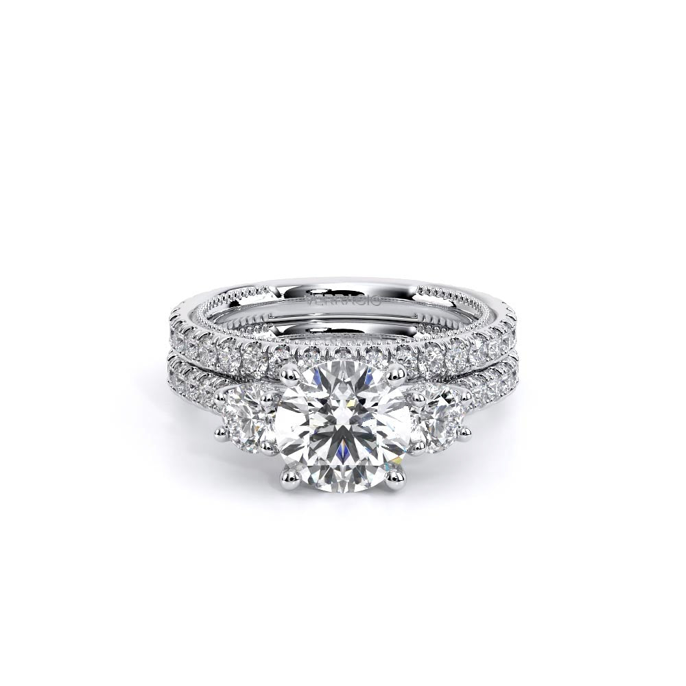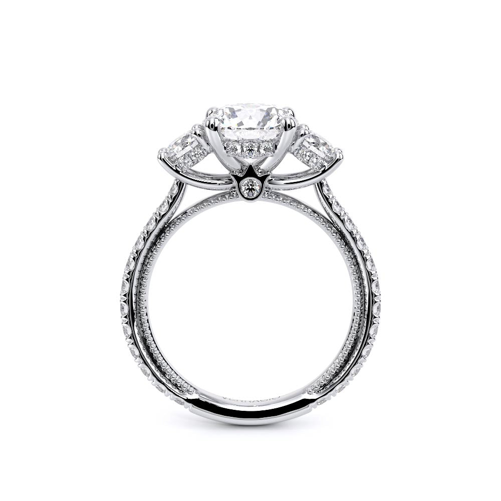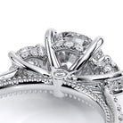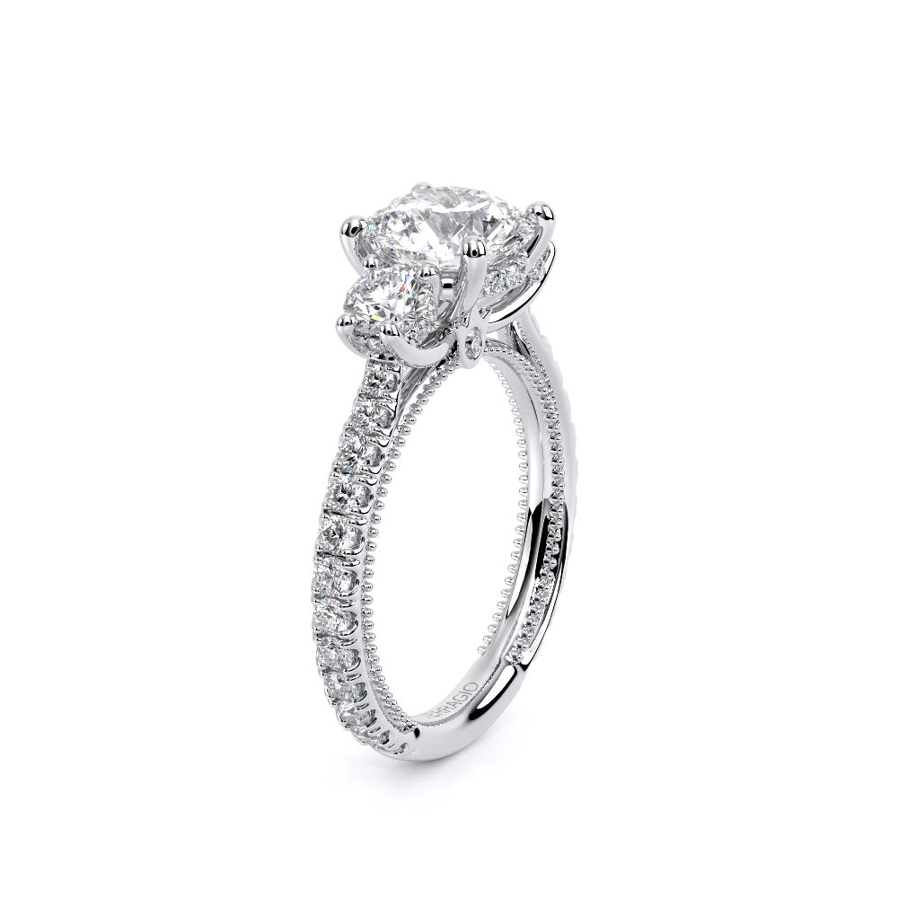 Renaissance-993R-1.7 features three dazzling stones representing past, present, and future. The cathedral shank adds modern elegance with its delicate diamonds. Milgrain detailing and the signature Verragio crest make this ring a symbol of timeless love and commitment.