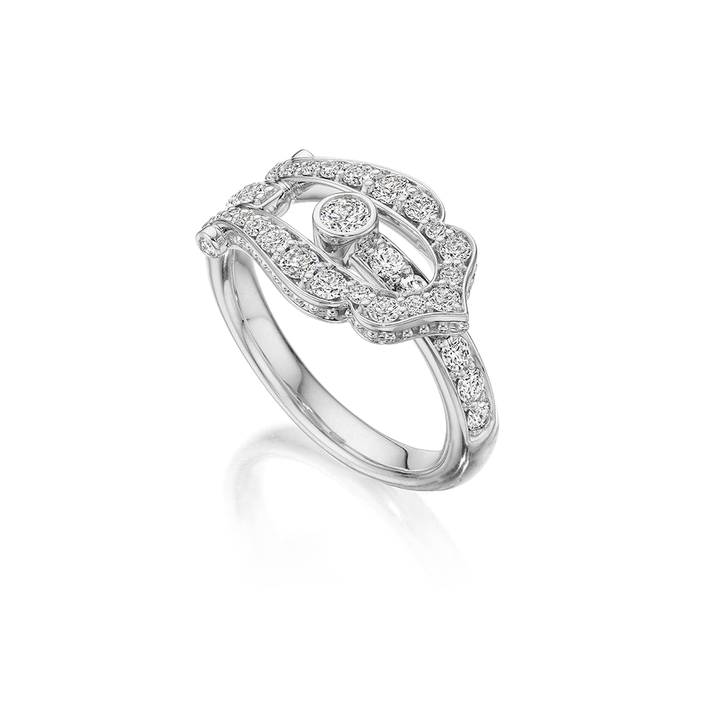 Veritage Signature Buckle ring reads pure sophistication in 18K white gold and diamonds. Timeless styling for everyday luxury.