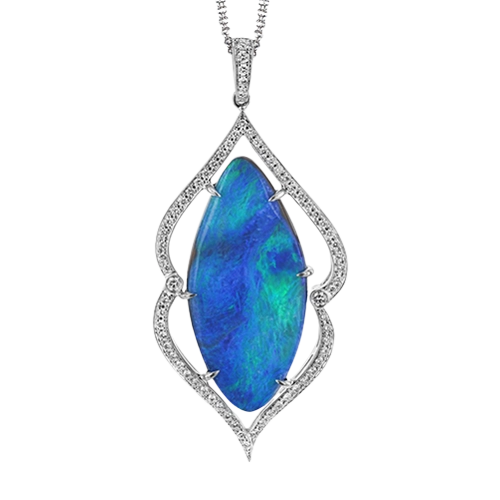 A one-of-a-kind statement pendant has an oval 11.88 ct. boulder opal, framed by an abstract line of white diamonds 0.31 ctw., on an 18" chain