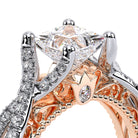 VENETIAN-5003 engagement ring from the Venetian Collection, features a pave' set diamond twisted shank showcasing handcrafted lace and Verragio signature beading. This beautiful vintage four-prong setting gives an illusion of a floating center stone and can accommodate almost any diamond cut desired.