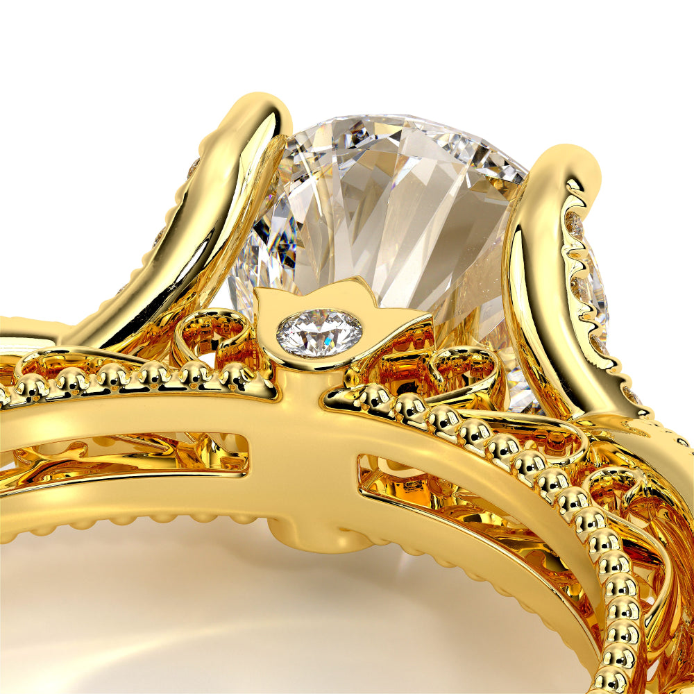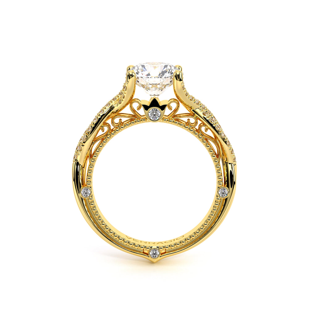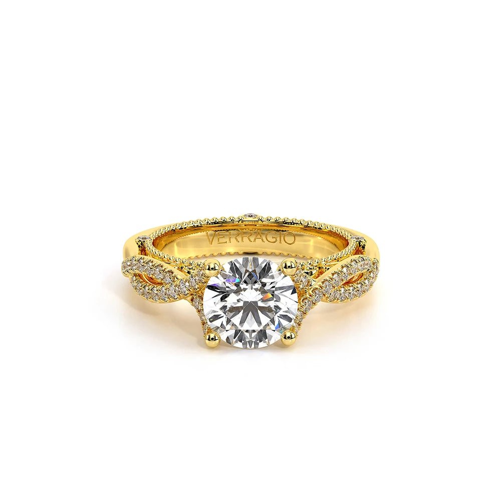 VENETIAN-5003 engagement ring from the Venetian Collection, features round brilliant-cut diamonds pave set in a twisted shank, enhancing the center stone giving an illusion of a floating diamond. Our beautiful Venetian lace and Verragio signature beading completes this vintage piece.