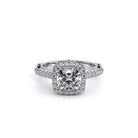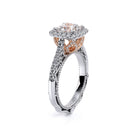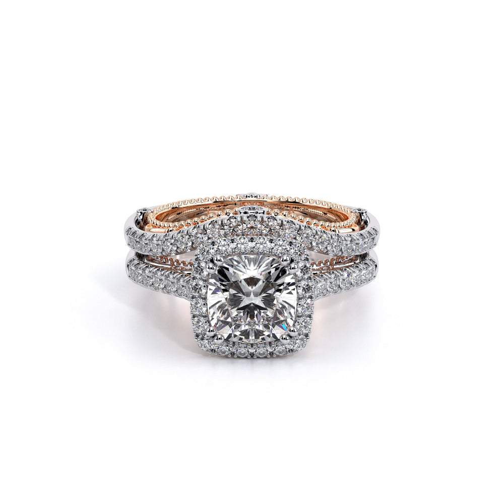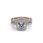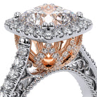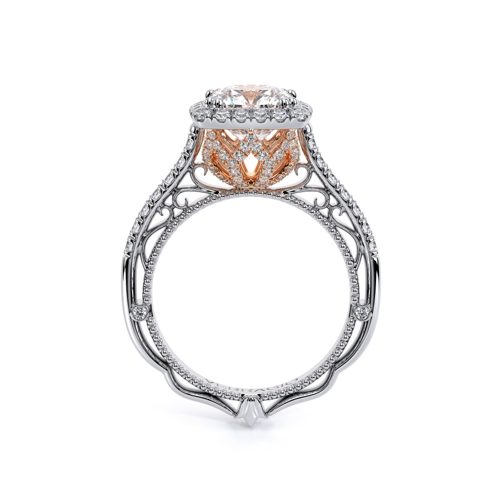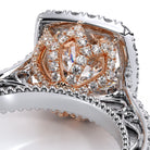VENETIAN-5061CU engagement ring from the Venetian Collection, features a unique diamond adorned basket in rose gold topped with a cushion shaped single halo made for a round center. A delicate straight shank encrusted with round brilliant diamonds completes this beautiful ornate design.