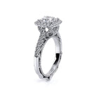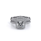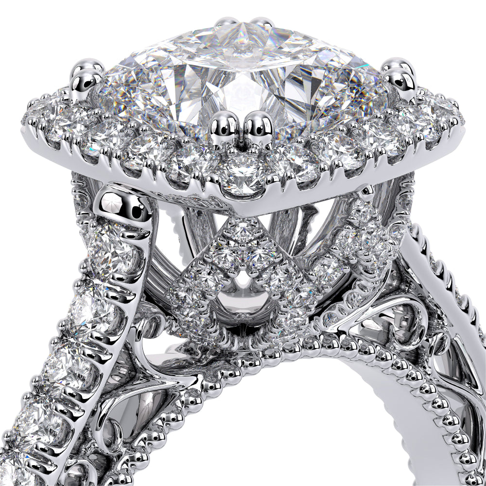 VENETIAN-5061CU engagement ring from the Venetian Collection, features a unique diamond adorned basket in rose gold topped with a cushion shaped single halo made for a round center. A delicate straight shank encrusted with round brilliant diamonds completes this beautiful ornate design.