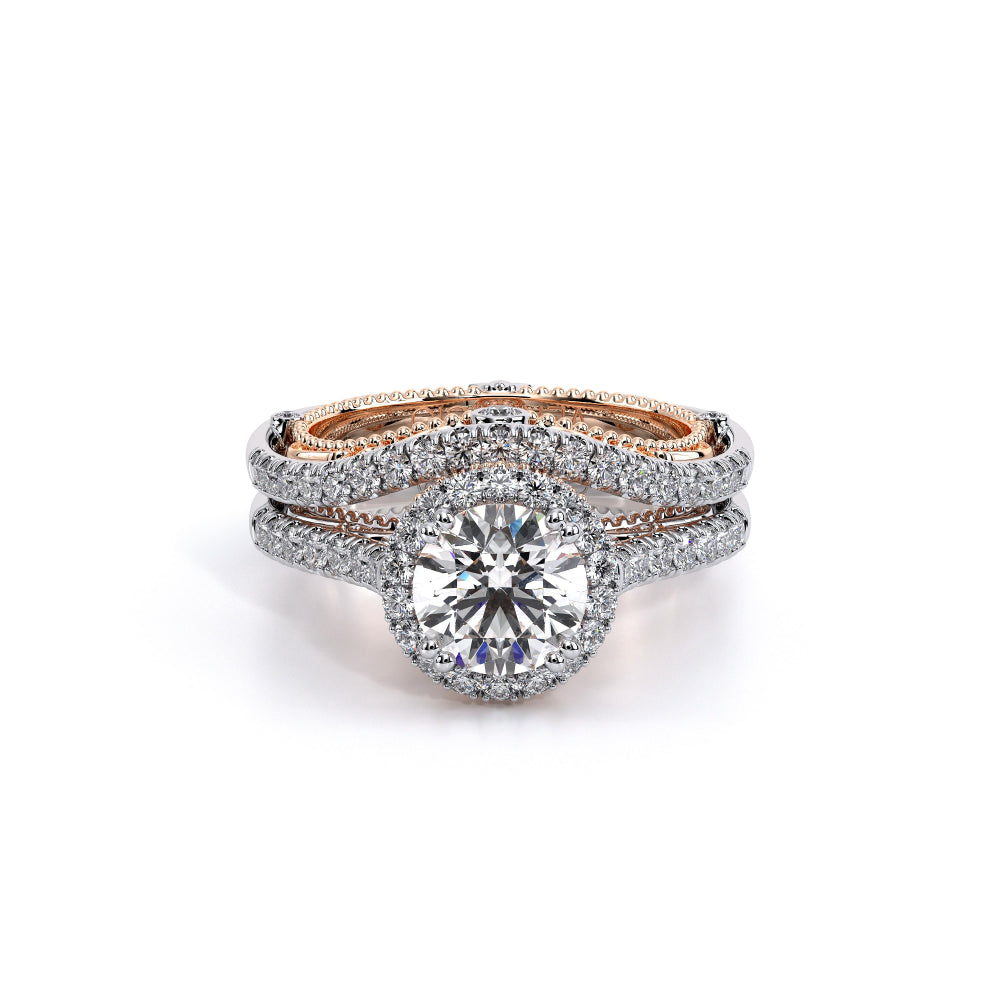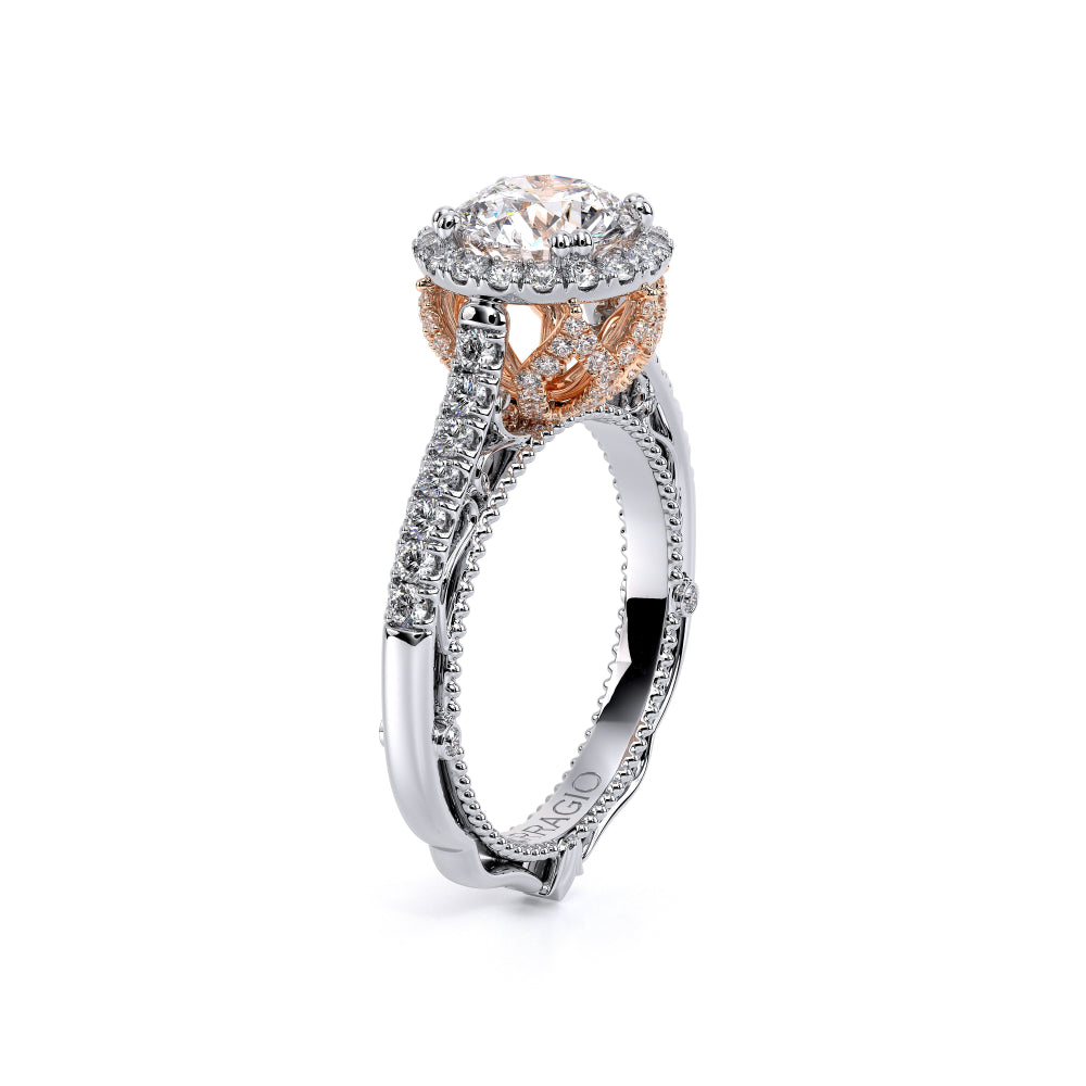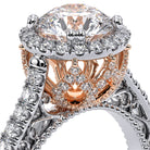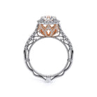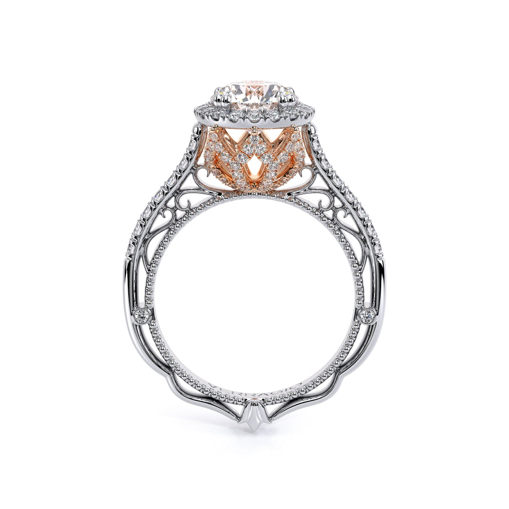 VENETIAN-5061R engagement ring from the Venetian Collection, features a unique diamond adorned basket topped with a round single halo. A delicate straight shank encrusted with round brilliant diamonds completes this beautiful ornate design.
