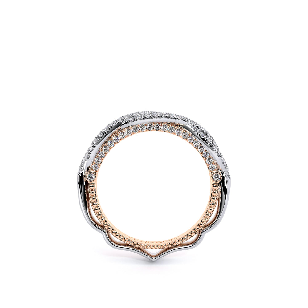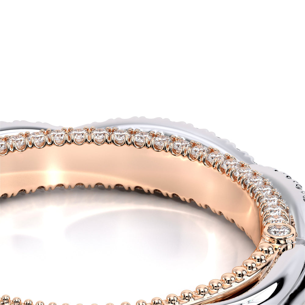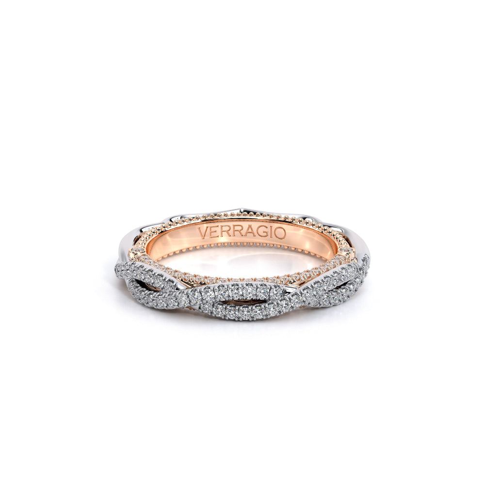 VENETIAN-5066W from the Venetian Collection, features a twisted band encrusted with round brilliant diamonds. The inner profile showcases a beautiful diamond Riviera infused seamlessly with our signature beading. Compliment your Verragio engagement ring by choosing either a twisted or a straight band.