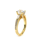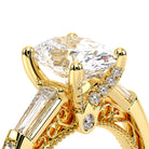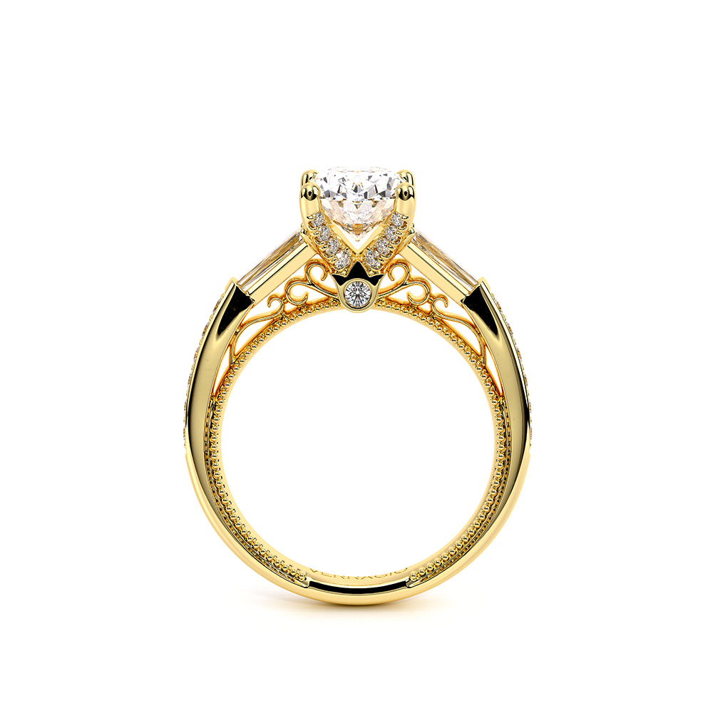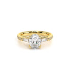 VENETIAN-5085OV is a three-stone diamond engagement ring adorned with meticulously set diamond prongs featuring two baguette diamonds seamlessly integrated on a straight diamond band. The inner profile showcases handcrafted lacework and our Verragio signature beading.