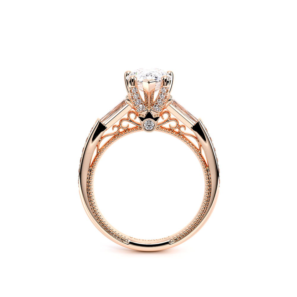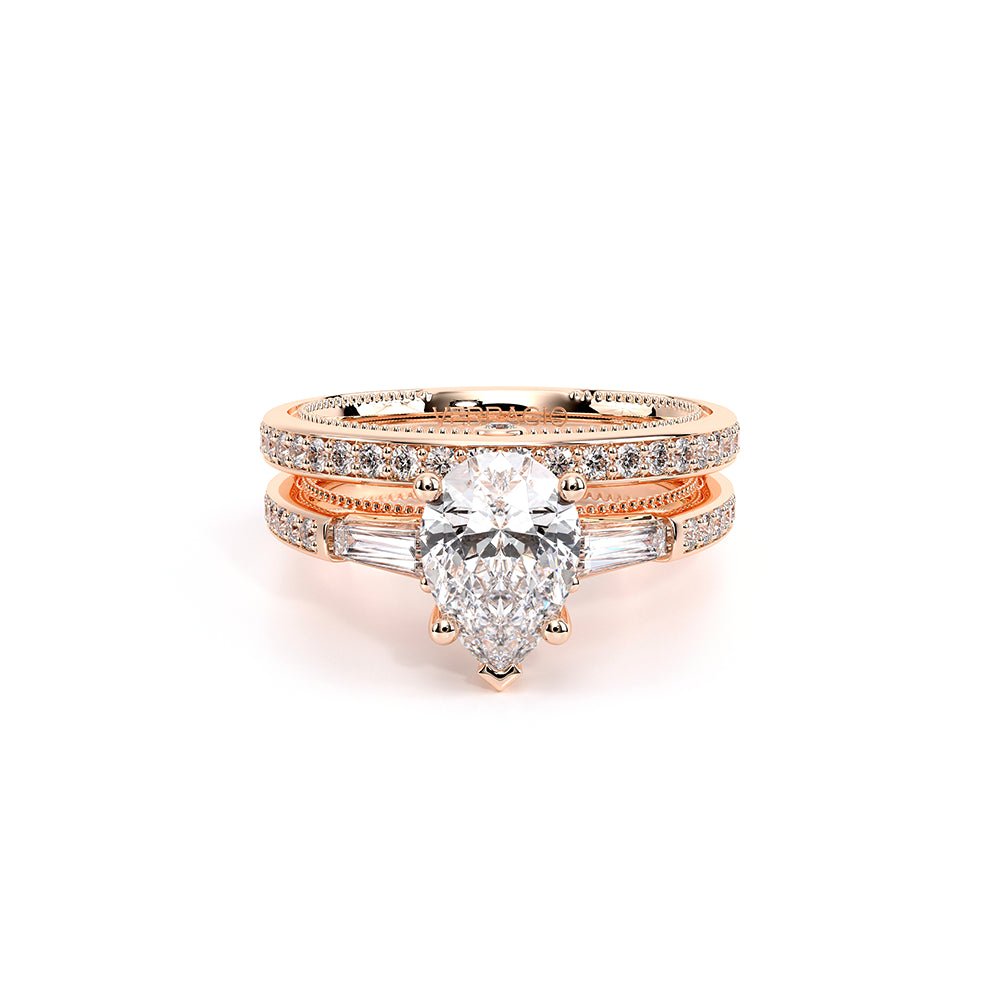 VENETIAN-5085PS is a three-stone diamond engagement ring adorned with meticulously set diamond prongs featuring two baguette diamonds seamlessly integrated on a straight diamond band. The inner profile showcases handcrafted lacework and our Verragio signature beading.
