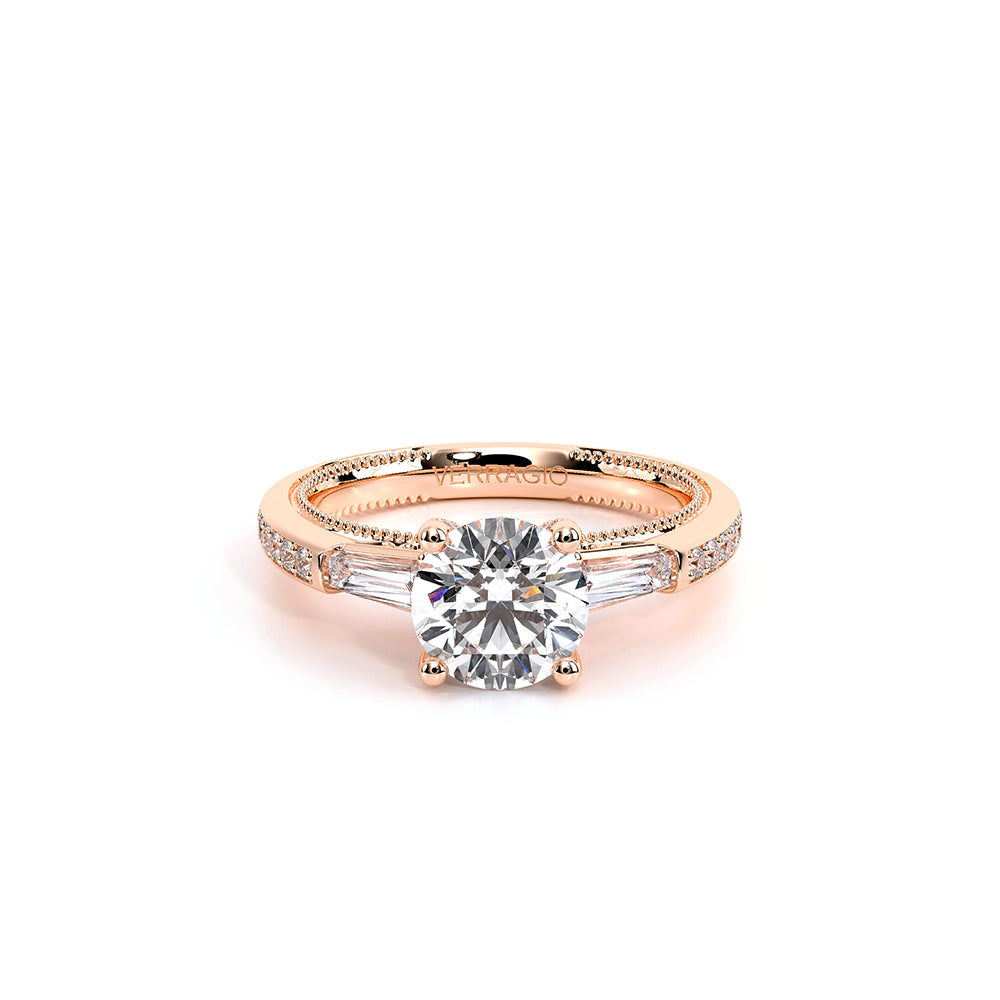 VENETIAN-5085R is a three-stone diamond engagement ring adorned with meticulously set diamond prongs featuring two baguette diamonds seamlessly integrated on a straight diamond band. The inner profile showcases handcrafted lacework amid our Verragio signature beading and crest.