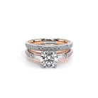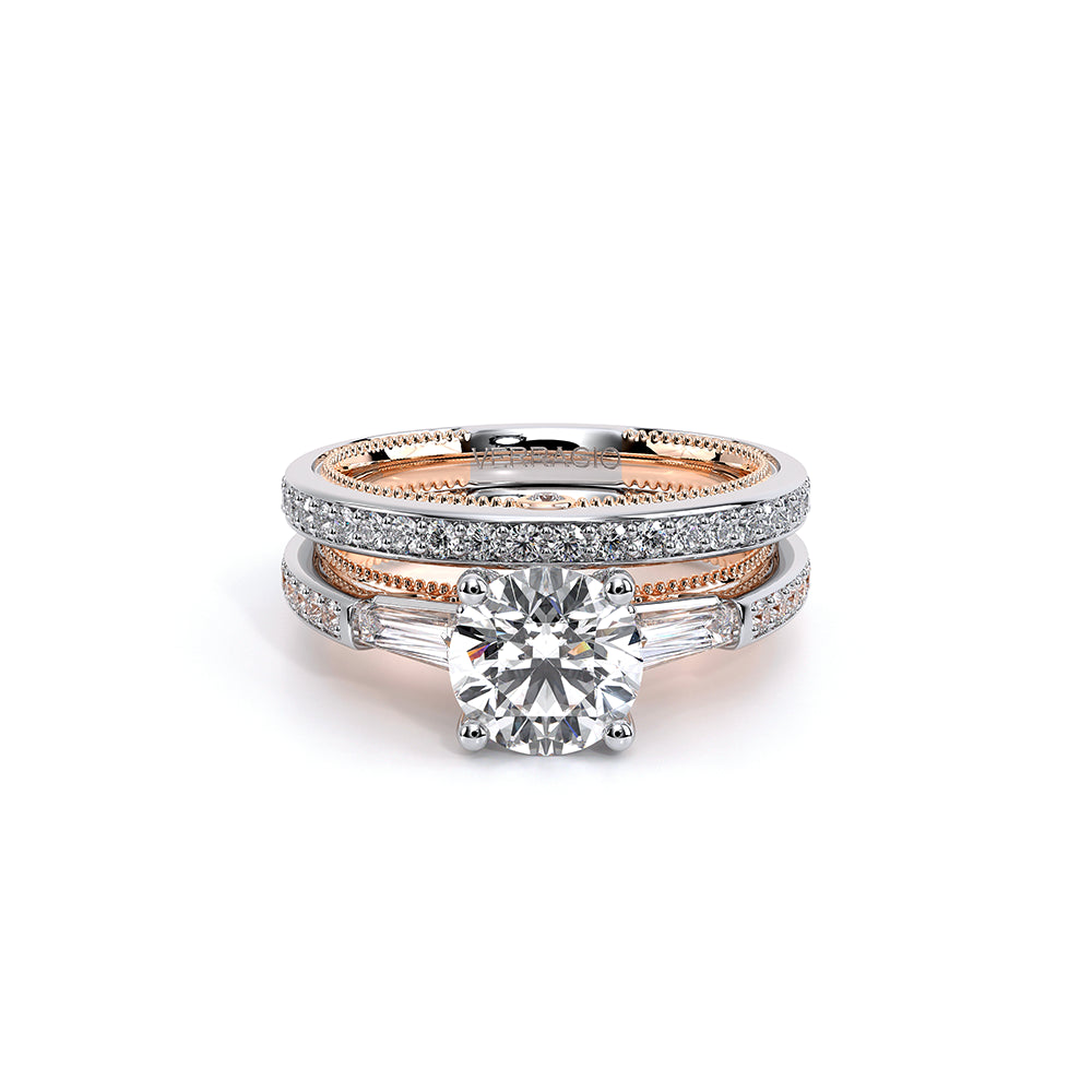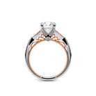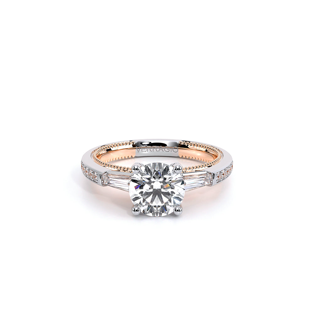 VENETIAN-5085R is a three-stone diamond engagement ring adorned with meticulously set diamond prongs featuring two baguette diamonds seamlessly integrated on a straight diamond band. The inner profile showcases handcrafted lacework amid our Verragio signature beading and crest.