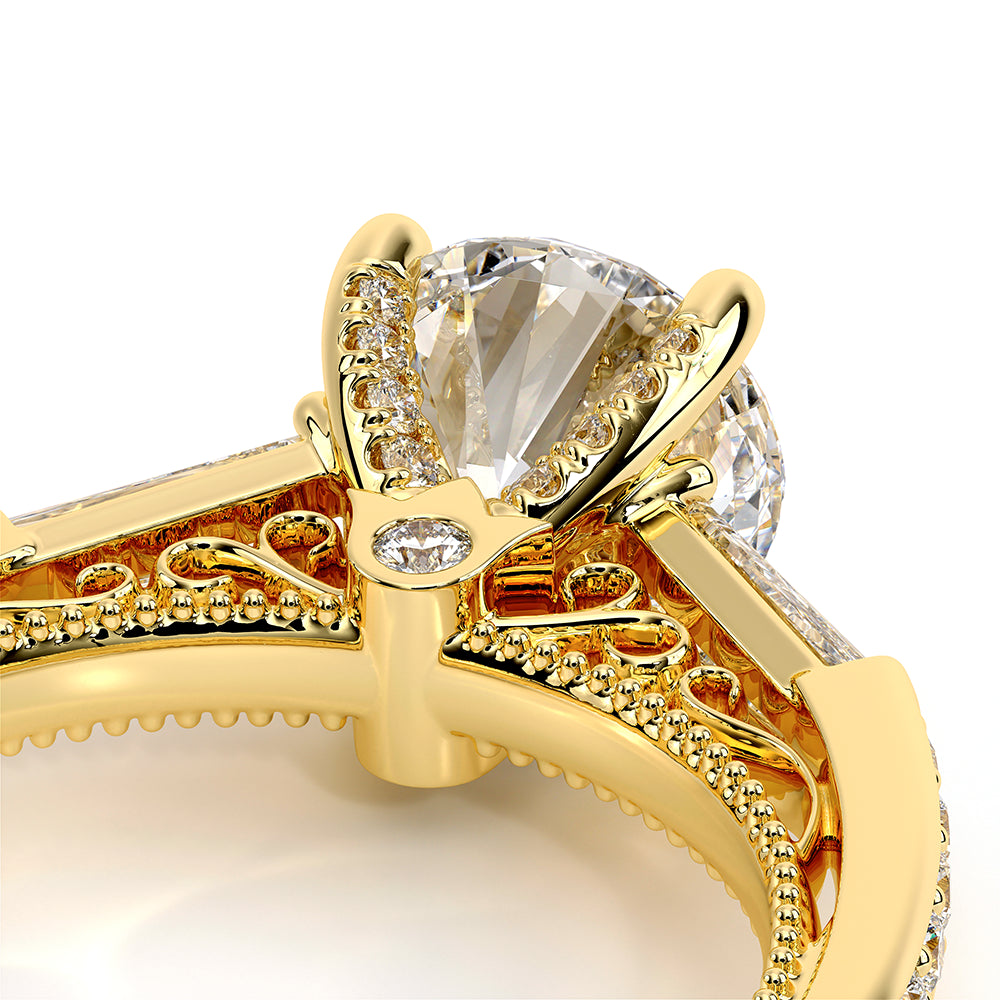 VENETIAN-5085R is a three-stone diamond engagement ring adorned with meticulously set diamond prongs featuring two baguette diamonds seamlessly integrated on a straight diamond band. The inner profile showcases handcrafted lacework amid our Verragio signature beading and crest.