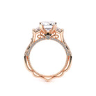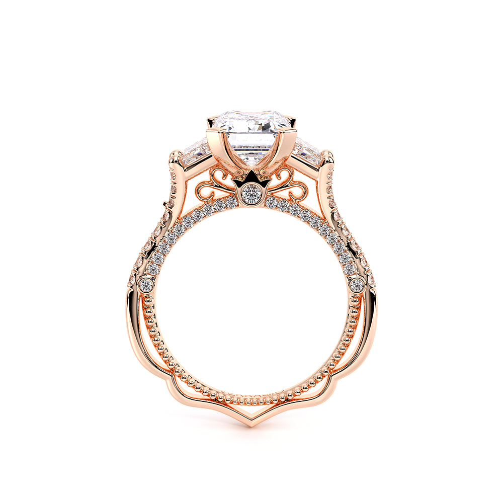 VENETIAN-5086EM is a three-stone engagement ring with trapezoid-cut side diamonds seamlessly integrated on a straight diamond band. The inner profile features our meticulously set half-diamond Riviera with handcrafted lacework, complete with Verragio's signature beading and crest.