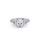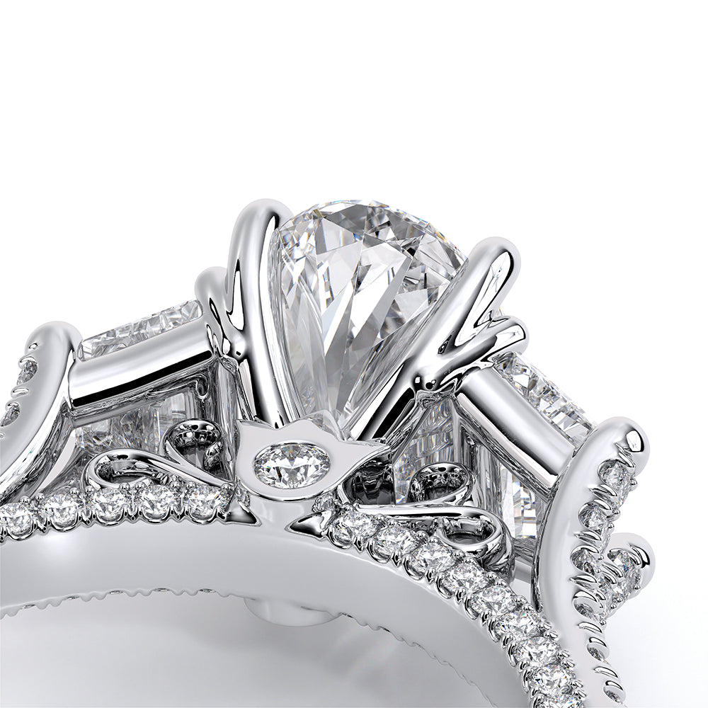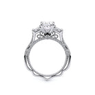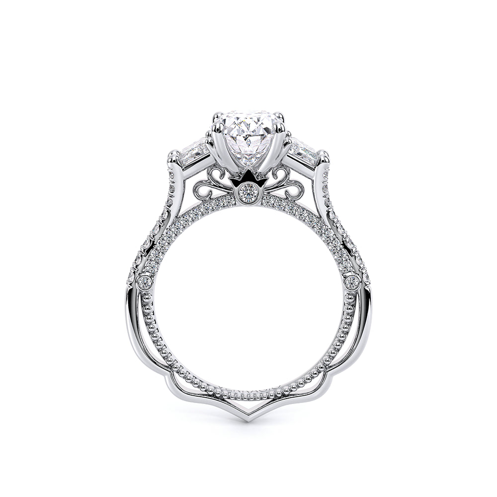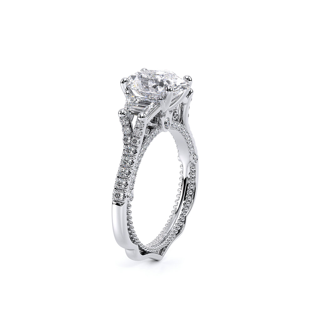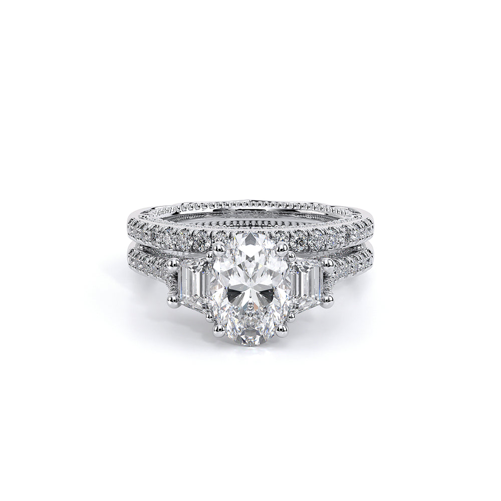 VENETIAN-5086OV is a three-stone engagement ring with trapezoid-cut side diamonds seamlessly integrated on a straight diamond band. The inner profile features our meticulously set half-diamond Riviera with handcrafted lacework, complete with Verragio's signature beading and crest.