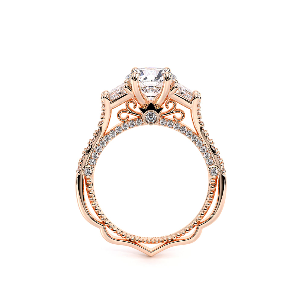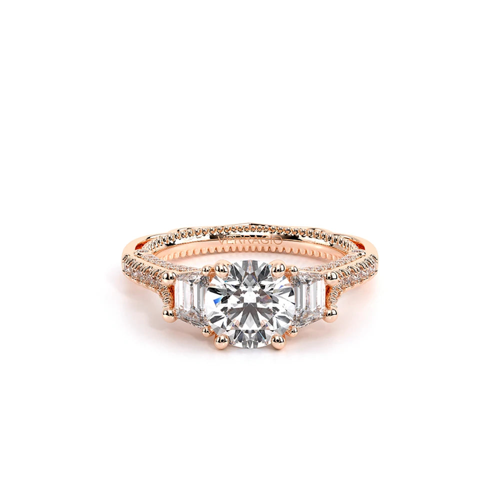 VENETIAN-5086R is a three-stone engagement ring with trapezoid-cut side diamonds seamlessly integrated on a straight diamond band. The inner profile features our meticulously set half-diamond Riviera with handcrafted lacework, complete with Verragio's signature beading and crest.