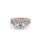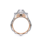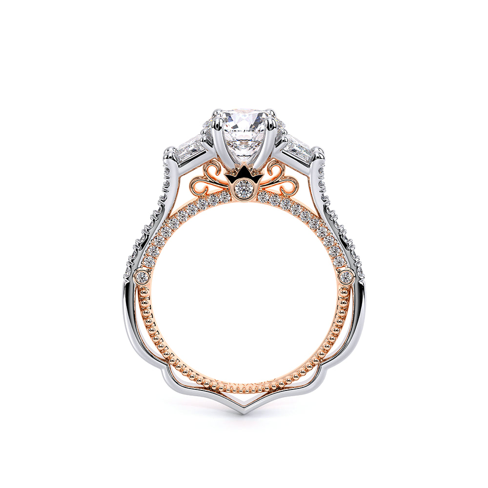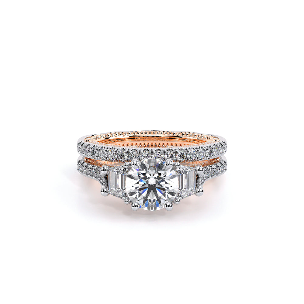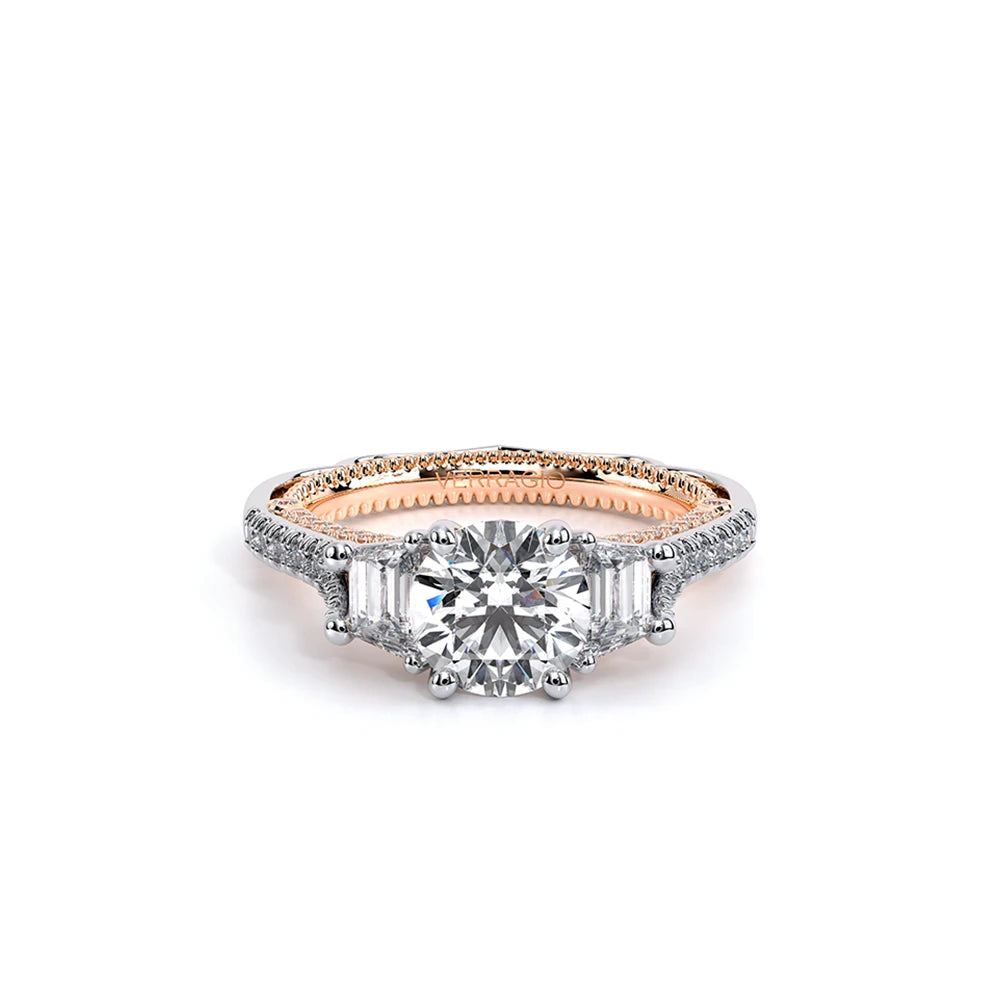 VENETIAN-5086R is a three-stone engagement ring with trapezoid-cut side diamonds seamlessly integrated on a straight diamond band. The inner profile features our meticulously set half-diamond Riviera with handcrafted lacework, complete with Verragio's signature beading and crest.