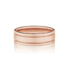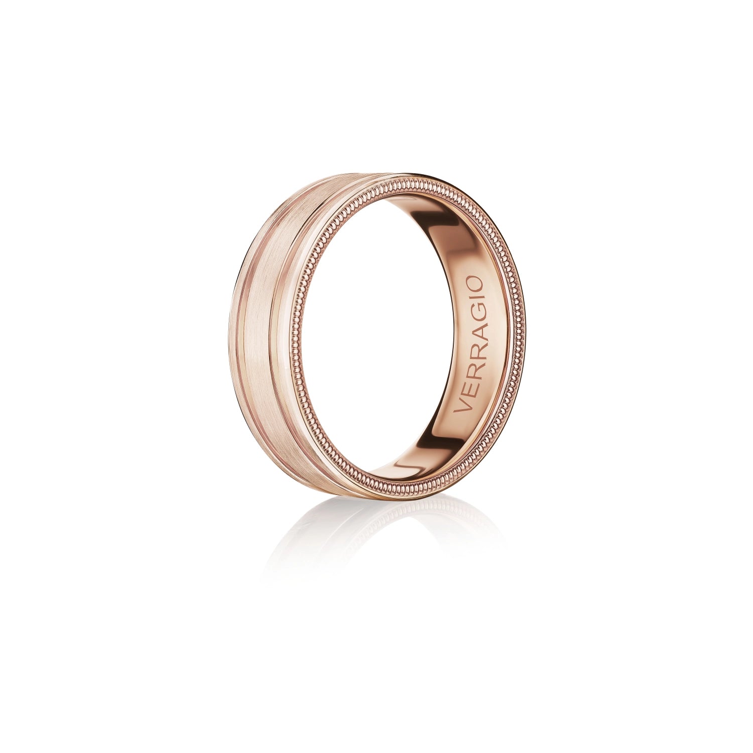 VW-7114 is our stylish 7MM width men's band with a matte finish elevated by the interior detailing of Verragio's signature rose gold beading along the edges. Along the heart of the ring run two grooves highlighting the rose gold in the band.