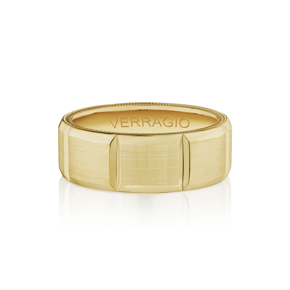 VW-8106 is our classic 8MM width men's band with a matte finish, accentuated with high polished edges. The modern geometric design carried throughout the ring is complimented by Verragio signature rose gold beading.