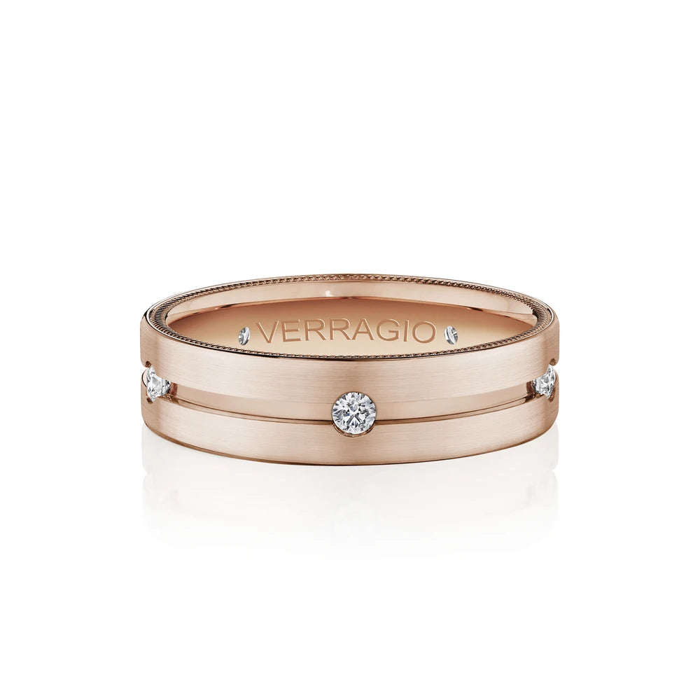 VWD-6921 is our sophisticated 6MM width diamond men's band with a matte finish. Adding to the elegance of this band are round brilliant-cut diamonds along a singular rose gold etched grove. Refined by Verragio's signature rose beading.