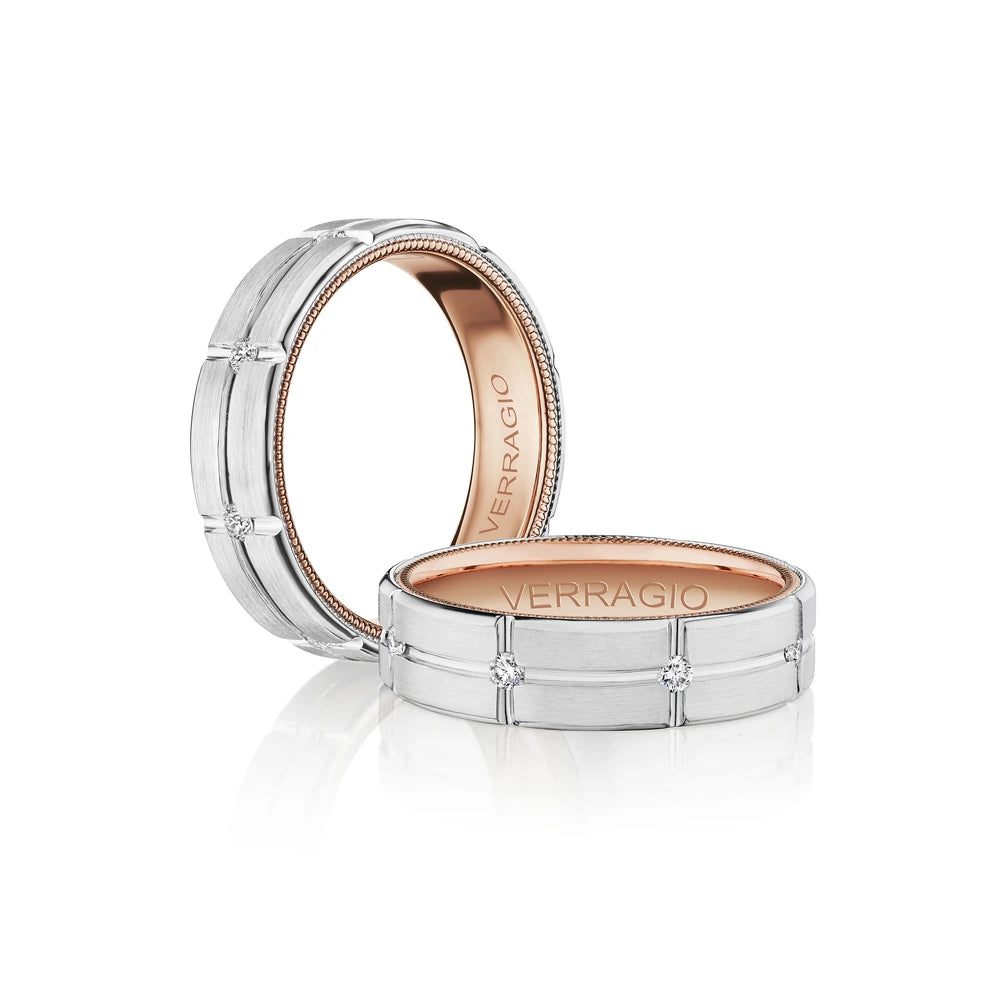 VWD-6921 is our sophisticated 6MM width diamond men's band with a matte finish. Running through the heart of the band are round brilliant-cuts within the singular etched grove, complimented by Verragio's rose gold signature beading.