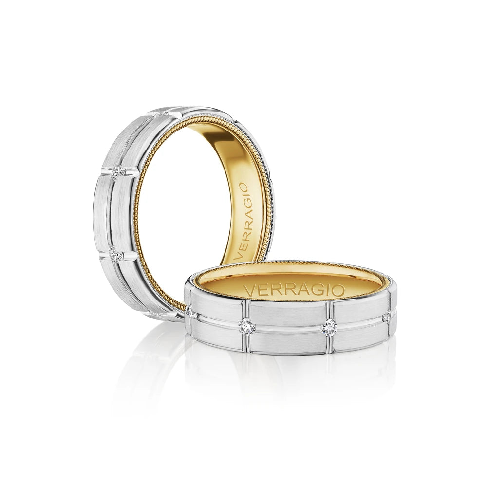 VWD-6921 is our sophisticated 6MM width diamond men's band with a matte finish. Running through the heart of the band are round brilliant-cuts within the singular etched grove, complimented by Verragio's rose gold signature beading.