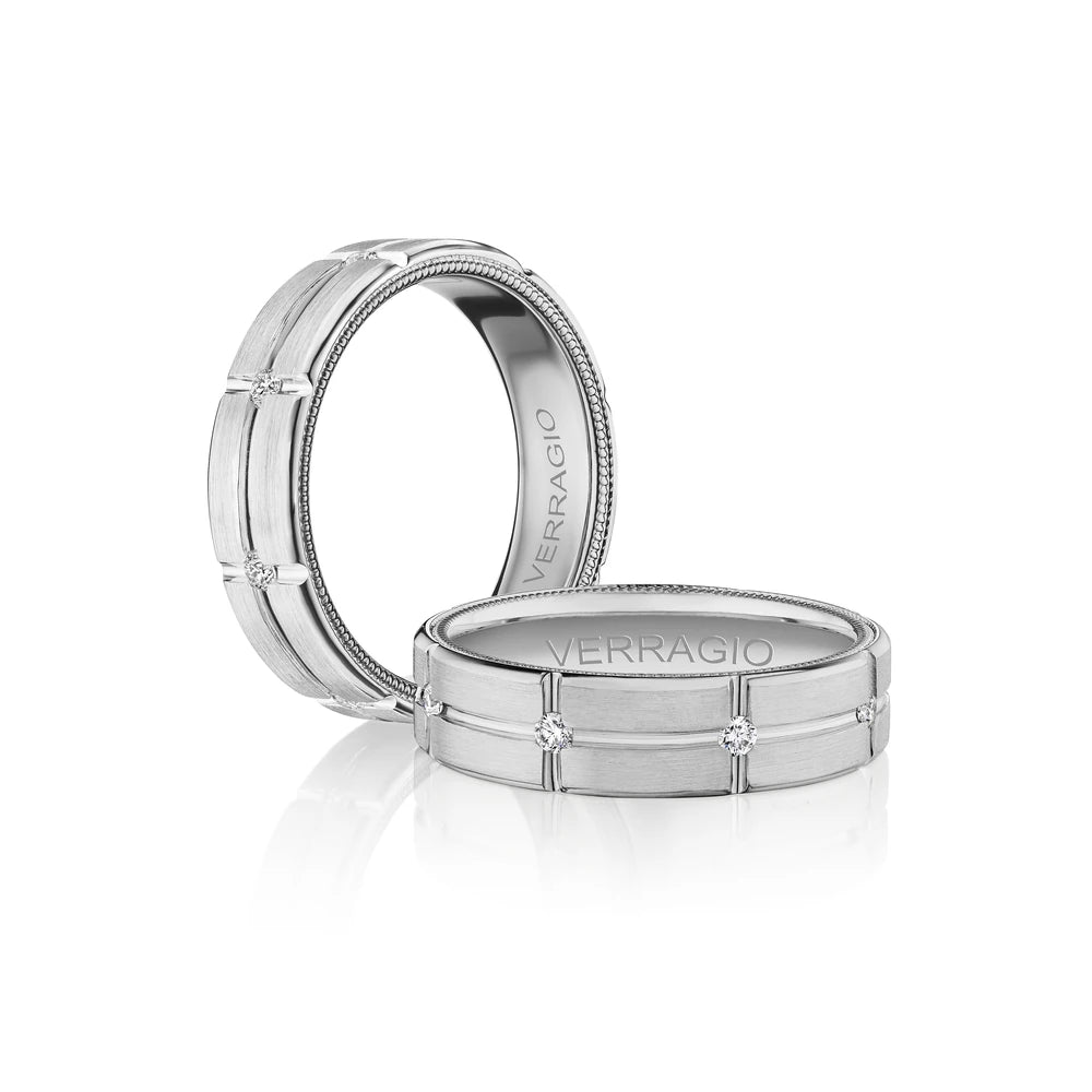 VWD-6921 is our sophisticated 6MM width diamond men's band with a matte finish. Running through the heart of the band are round brilliant-cuts within the singular etched grove, complimented by Verragio's rose gold signature beading.