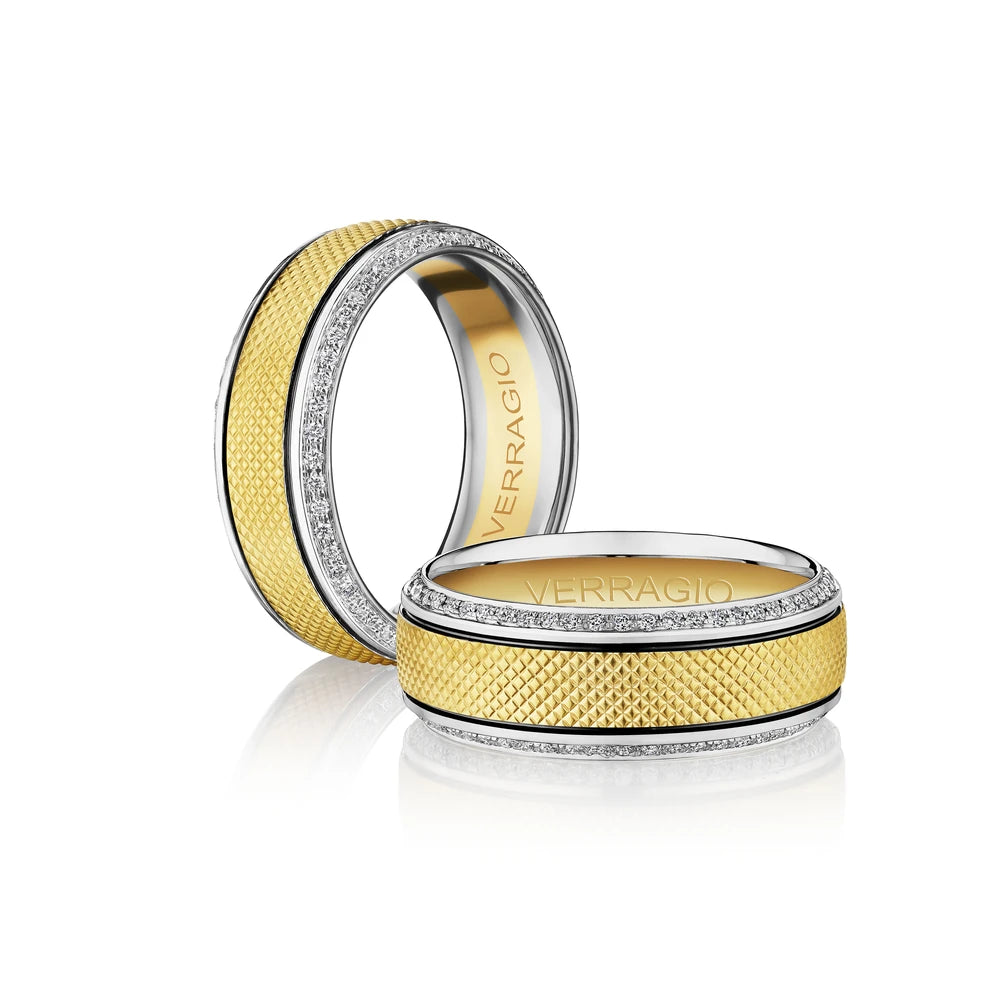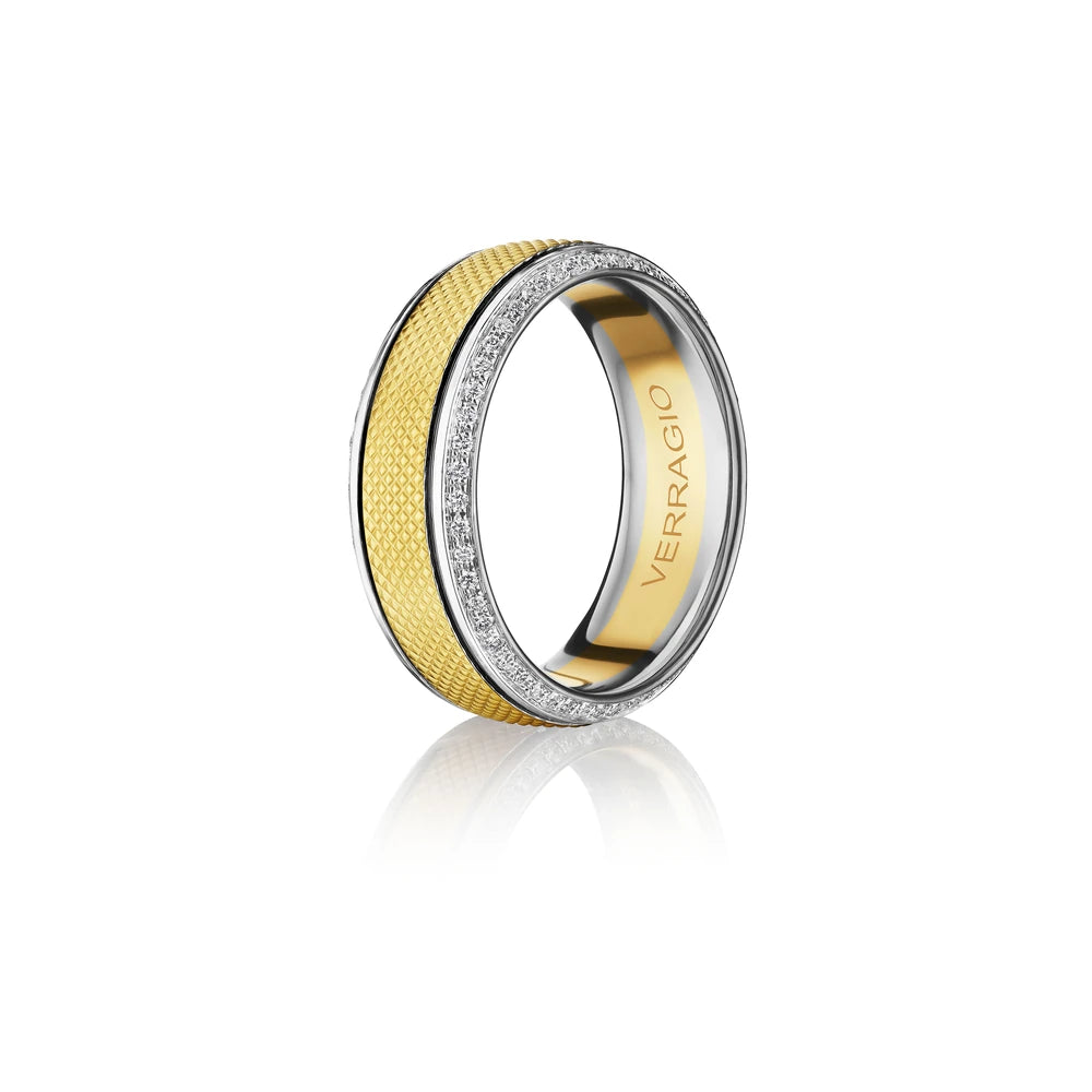 VWD-8913 is a textured embellished band enriched with a black rhodium trim adorned with pav�� diamond edges, perfect for a statement of strength and elegance.