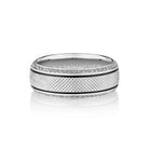 VWD-8913 is a textured embellished band enriched with a black rhodium trim adorned with pav�� diamond edges, perfect for a statement of strength and elegance.