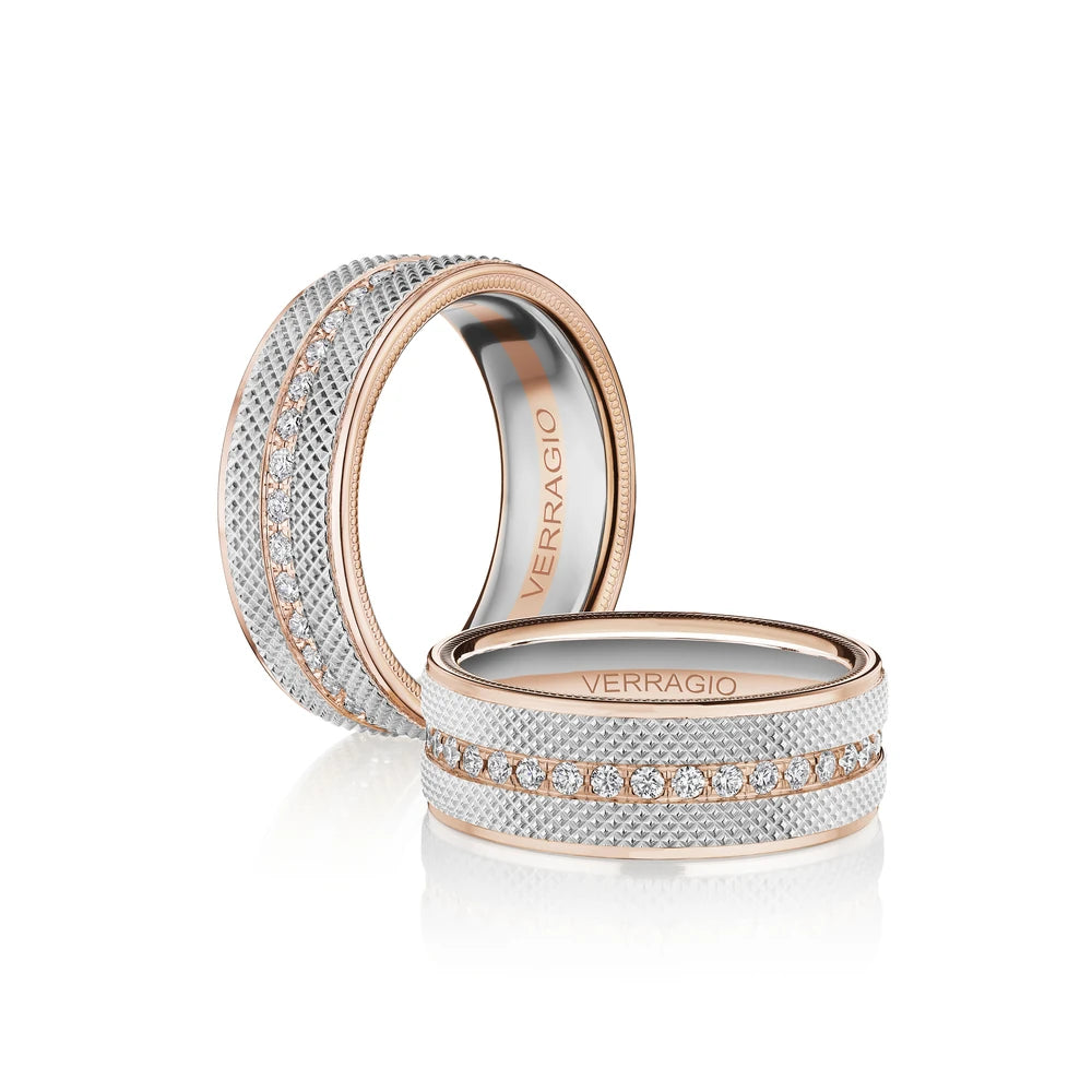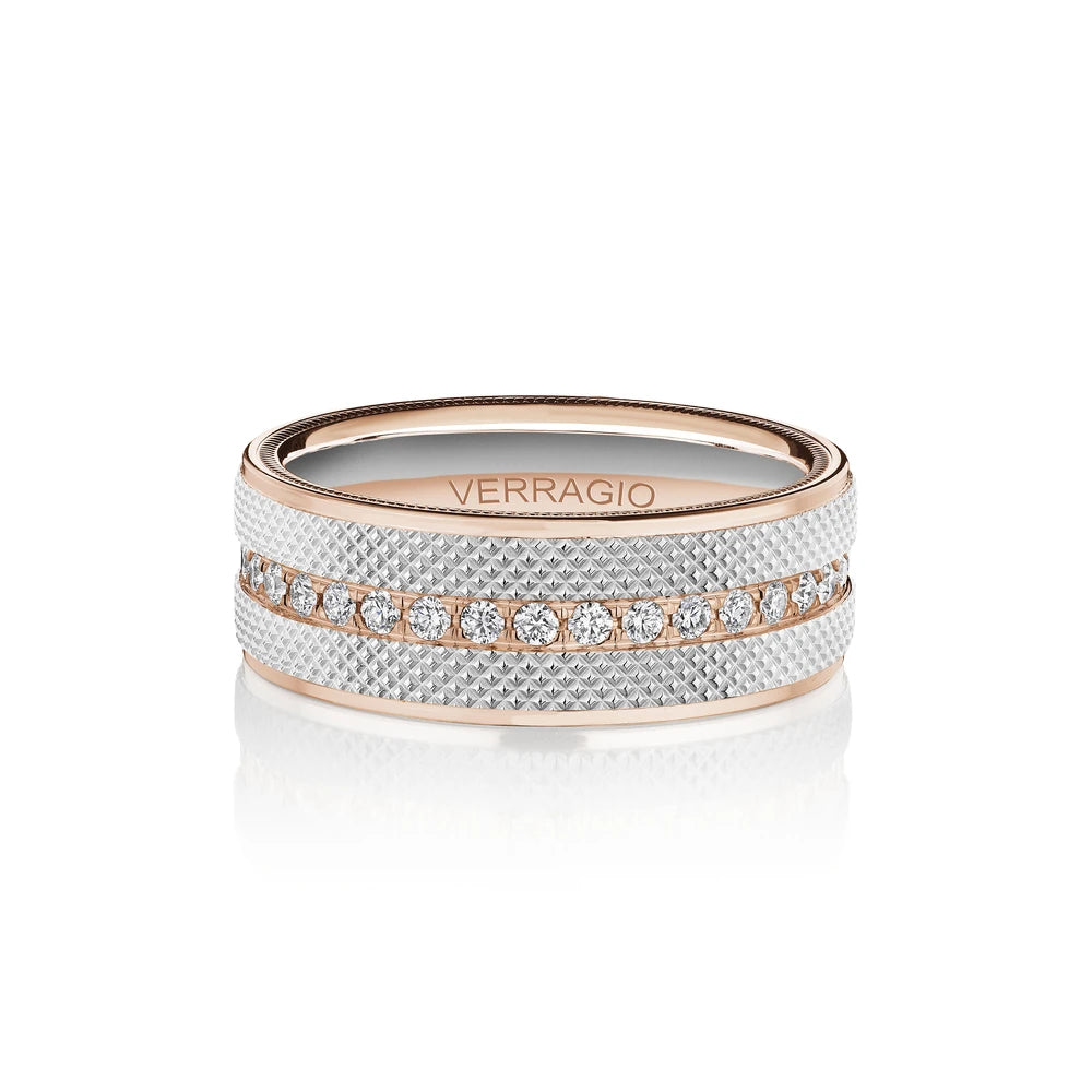 VWD-8915 features a textured embellished band with a seamless string of meticulously set diamonds, offering a fashionable cutting-edge.