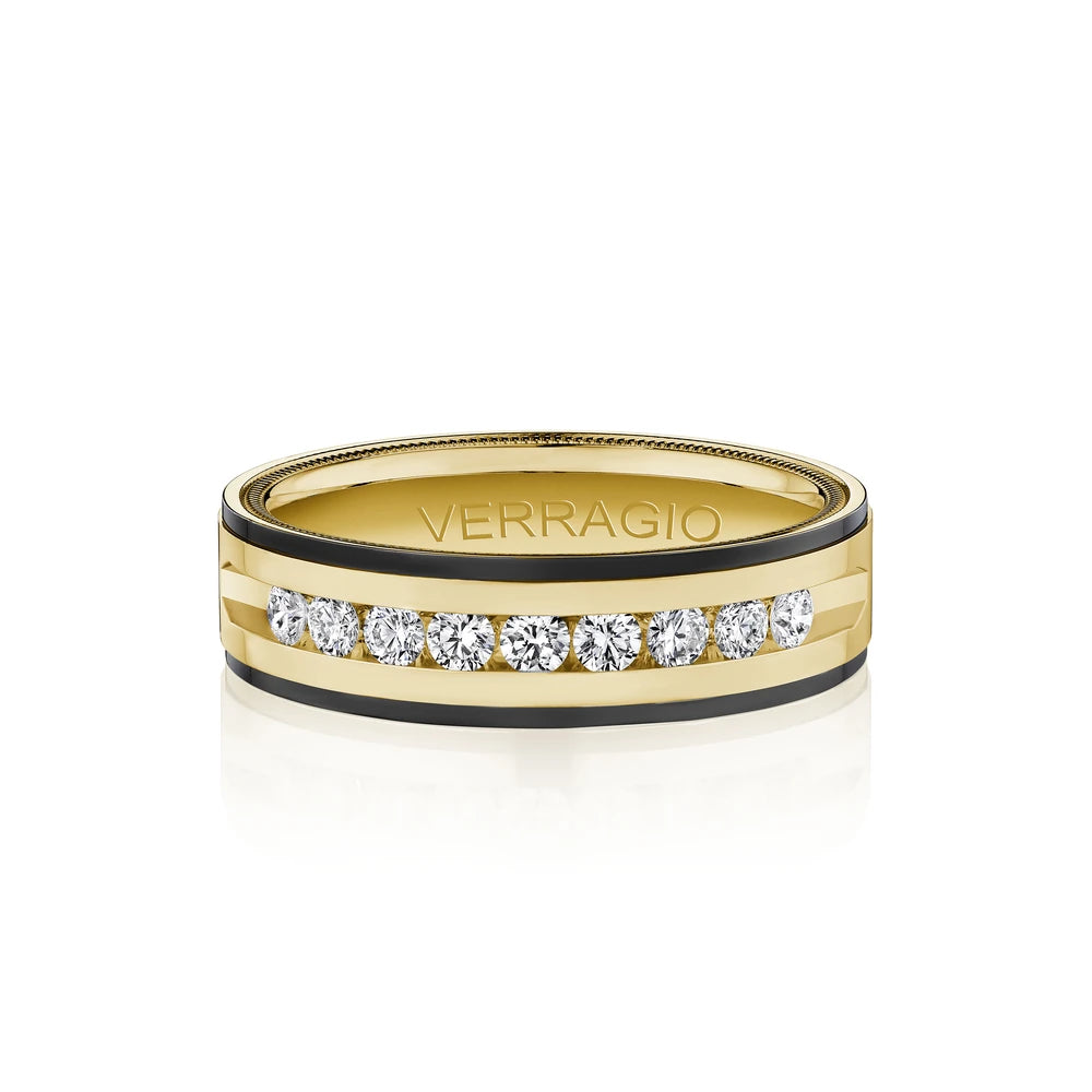 The VWRD-6704-2.5 features a distinctive 6mm band with a step-cut center that elegantly houses a channel-set diamond line of 2.50mm stones. The design is further enhanced by black enamel along the edges and meticulous beading, offering a striking contrast and a sophisticated, detailed finish. This band is perfect for those who value precision and a contemporary twist on classic elegance.