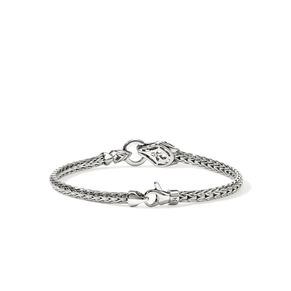 A graphic chain bracelet featuring the hand-carved Naga dragon—a legendary Balinese symbol of love, protection and prosperity. Artisan handcrafted in reclaimed sterling silver with ethically sourced diamond accents and blue sapphire eyes.