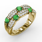 This emerald and diamond double row ring comes in a variety of material types like 14k white gold, yellow gold, rose gold and can be customized with your jeweler. Fana gemstone fashion rings are perfect for that special woman in your life.
