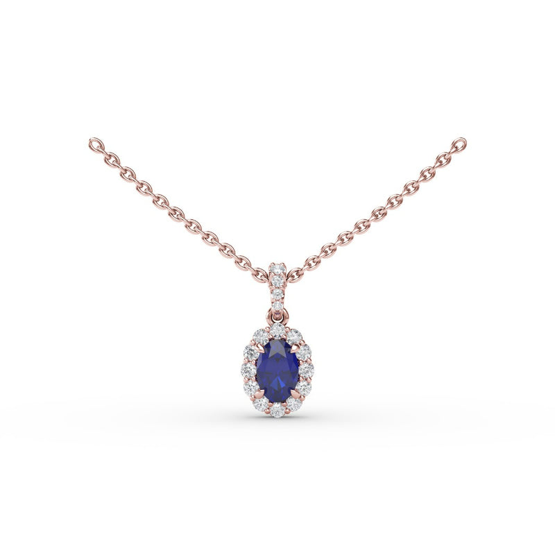 Accessorize your everyday look with this sapphire and diamond halo necklace. This necklace comes in a variety of material types like 14k white gold, yellow gold, rose gold and can be customized with your jeweler. Classic Fana gemstone necklaces are perfect for that special woman in your life.