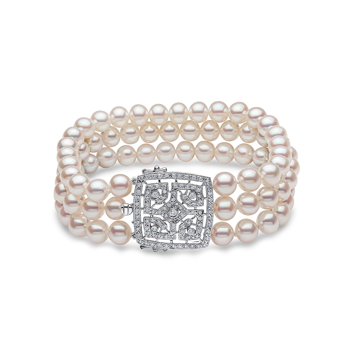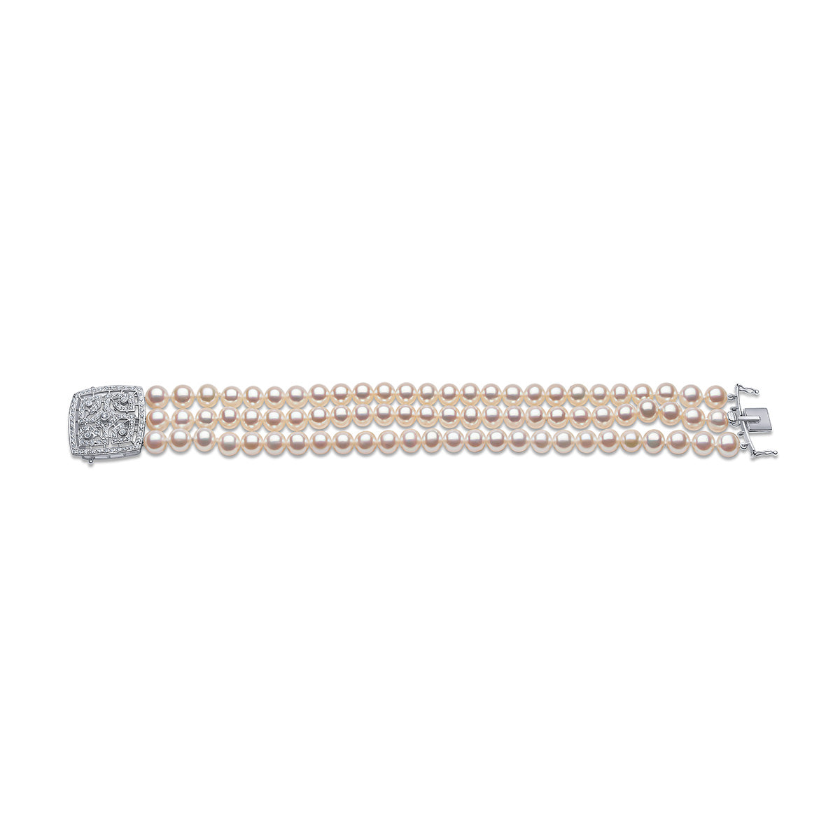 Our three-row pearl bracelet from the Classic Collection, crafted from lustrous white freshwater pearls. The elegant design is completed with an intricately detailed 18k white gold clasp, featuring a refined geometric silhouette adorned with shimmering diamonds. This piece beautifully combines timeless sophistication with modern flair, perfect for any occasion.