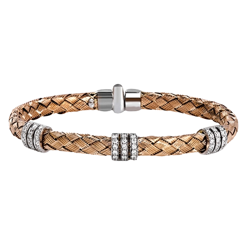 Carefully woven from 18k rose gold, this remarkable bangle bracelet is perfect for everyday wear as well as formal occasions with .72 ctw of white diamonds. Perfect for stacking.