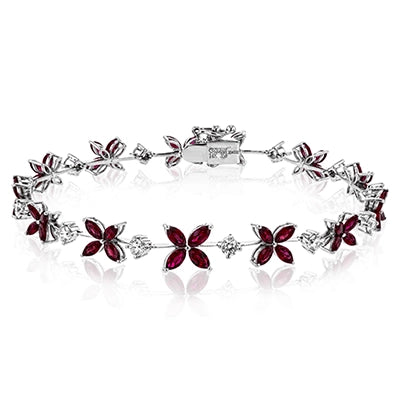This bracelet charms with a floral design set with 3.58 ctw of rubies and .96 ctw of white diamonds.