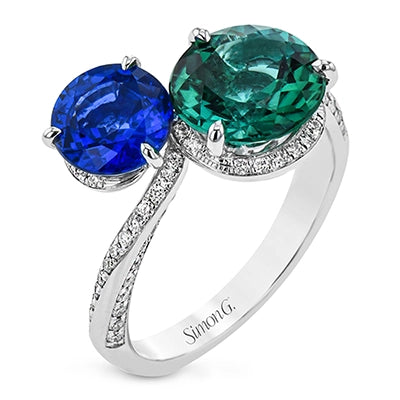 Double with fun with this dynamic duo of exquisite cool-toned gems in this 18k white gold ring: A 1.57 ct blue sapphire and a 2.43 green tourmaline.