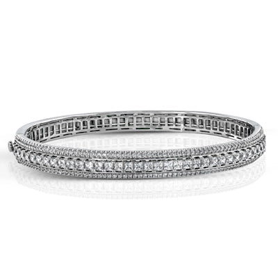 This 18k bangle provides extra sparkle with .93 ctw of round white diamonds in rows flanking 3.19 ctw of princess cut white diamonds.