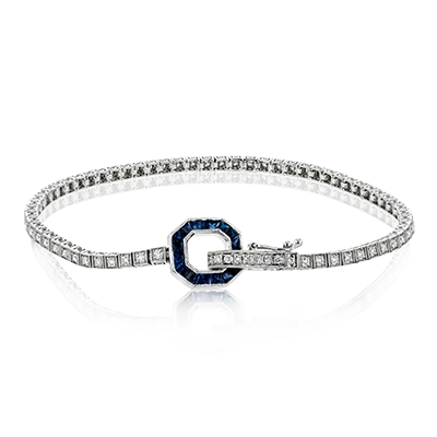This 18k white gold tennis bracelet features white diamonds along its length, while the octagonal clasp is set with princess cut sapphires to add a vintage touch to the design.