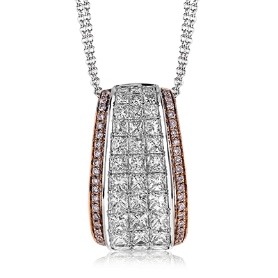 The lovely contemporary design of this white and rose gold pendant is enhanced by the presence of .14 ctw round cut pink diamonds complemented by 1.42 ctw princess cut white diamonds.