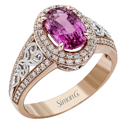 18KWR right hand ring with an intricate design along the shank has a diam halo .55 ctw, and an oval KNZT 5.89 ctw.