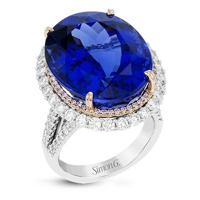 Opulent and glamorous, this white and rose gold ring features a jaw-dropping 28.60 ctw oval shaped tanzanite ringed by a double halo and a total of 1.80 ctw of round white diamond accents.