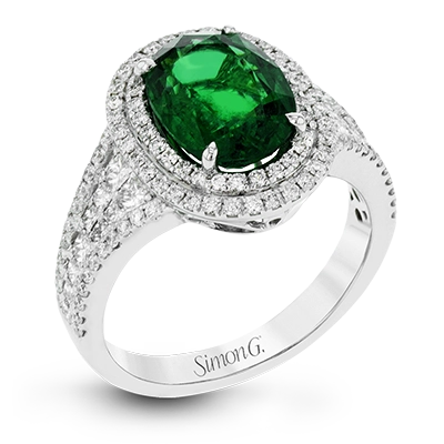 This beautiful white gold ring dazzles with its 2.56 ctw oval shaped emerald centerpiece, flanked by .50 ctw of round white diamonds and .45 ctw of princess cut white diamonds.